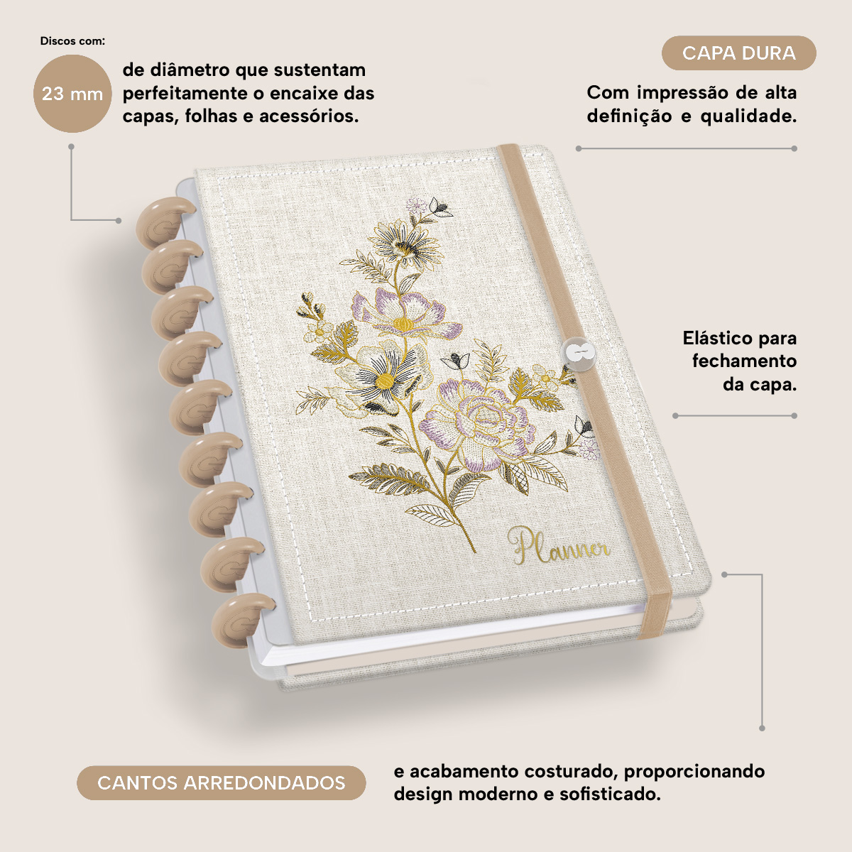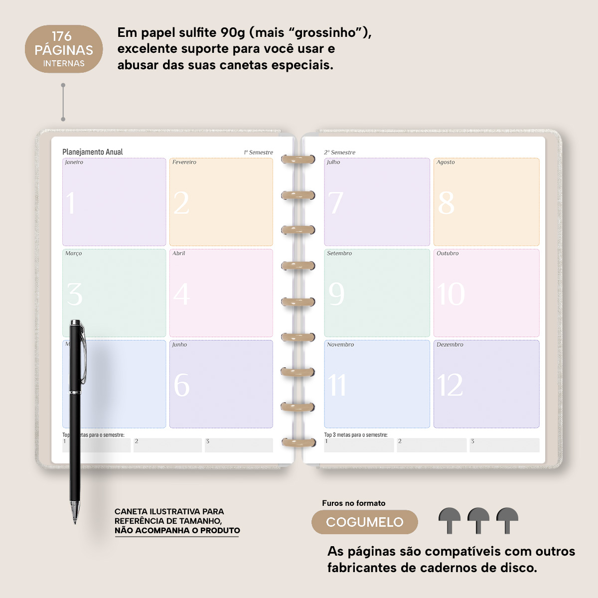 O miolo conta com páginas decoradas em papel sulfite 90g (aquele papel mais "grossinho"), para que você use e abuse das suas canetas especiais. Com furos no formato de "cogumelo", você poderá dar um "up" nele com nossos refis, além de ser compatível com outros fabricantes de cadernos e planners de discos.
