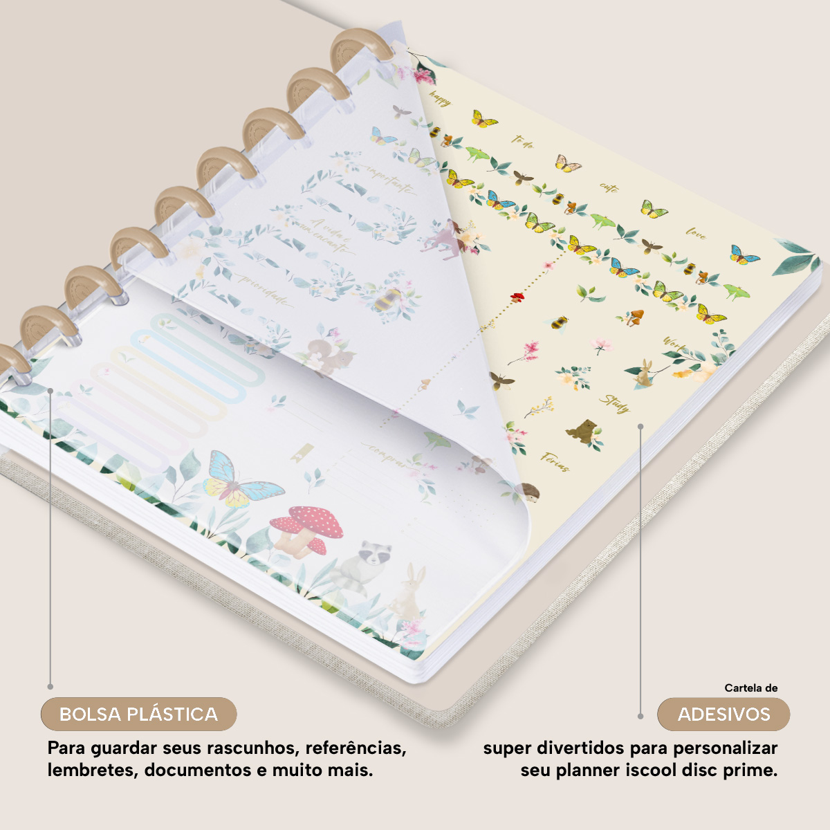 Além de tudo isso, o Iscool Disc Planner Datado 2026 conta com detalhes que fazem toda a diferença: elástico para fechamento da capa, proporcionando muito mais estilo e privacidade para suas anotações; e uma cartela de adesivos incríveis para que você possa personalizar o planner do seu jeitinho!