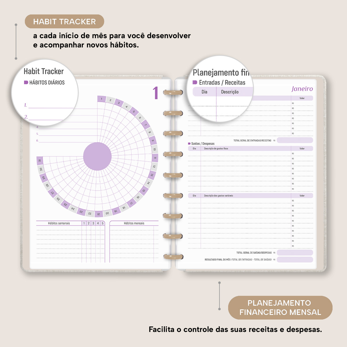 No início de cada mês, há um planejamento mensal, facilitando visualmente as suas principais anotações, um "Habit Tracker" para você desenvolver novos hábitos ou controlar os mais importantes, e ainda um planejamento financeiro, facilitando o controle das suas receitas e despesas, além de inúmeras outras funcionalidades.