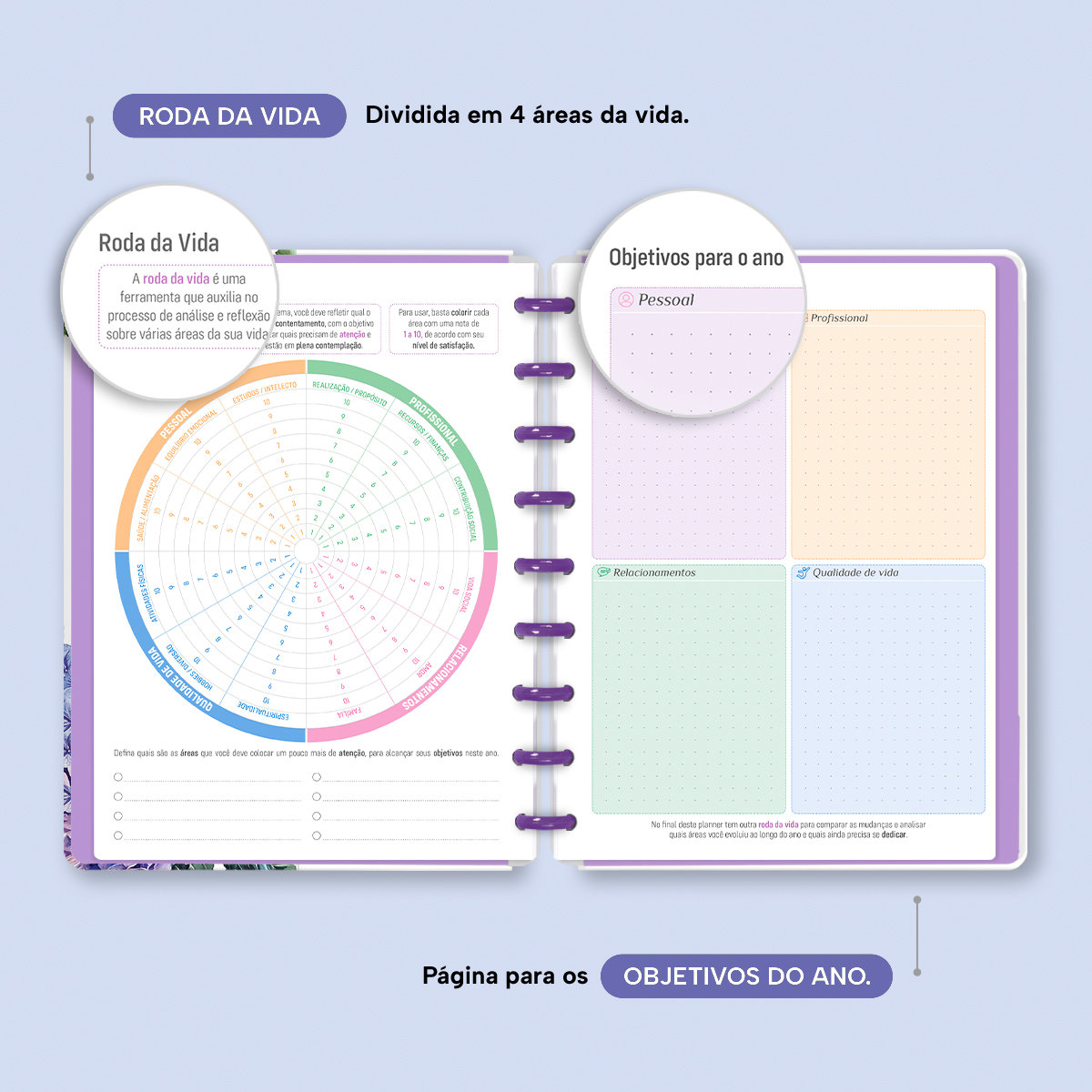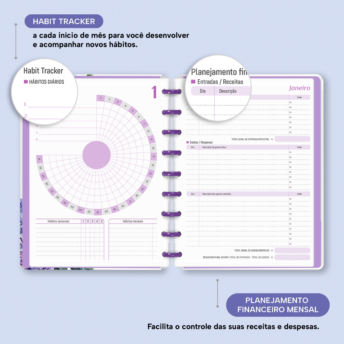 No início de cada mês, há um planejamento mensal, facilitando visualmente as suas principais anotações, um "Habit Tracker" para você desenvolver novos hábitos ou controlar os mais importantes, e ainda um planejamento financeiro, facilitando o controle das suas receitas e despesas, além de inúmeras outras funcionalidades.