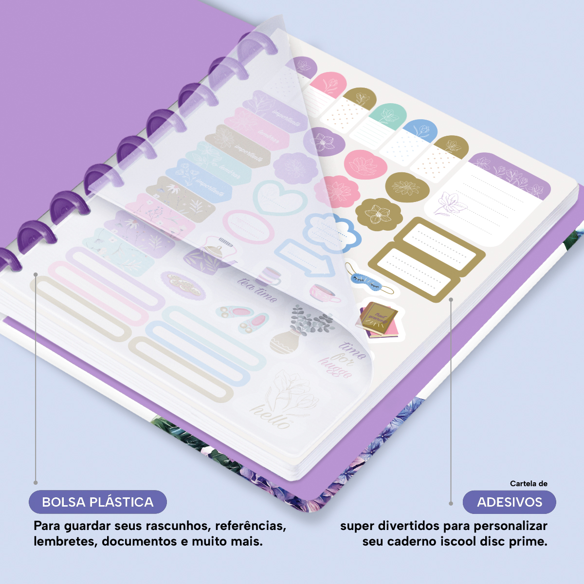 Além de tudo isso, o ISCOOL DISC Planner Datado conta com detalhes que fazem toda a diferença: elástico para fechamento da capa, proporcionando muito mais estilo e privacidade para suas anotações; e uma cartela de adesivos incríveis para que você possa personalizar o planner do seu jeitinho!