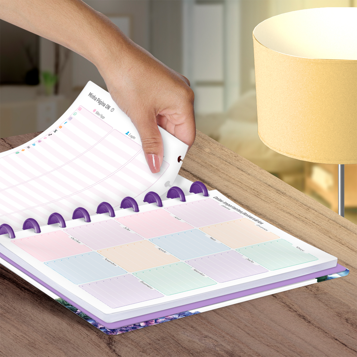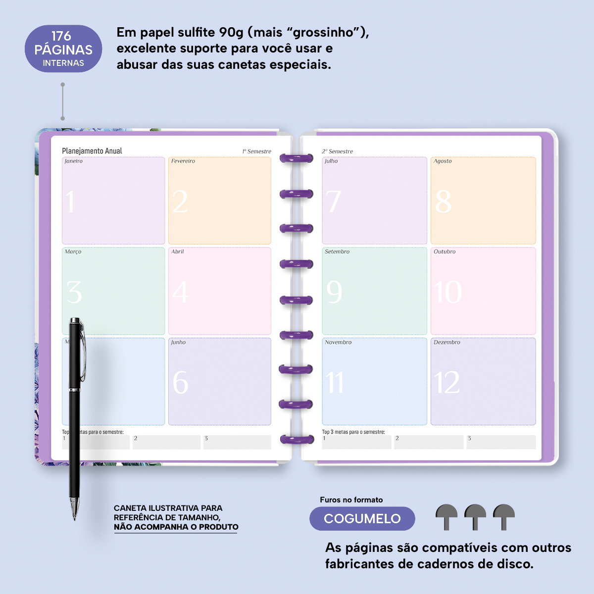 O miolo conta com páginas decoradas em papel sulfite 90g (aquele papel ainda mais "grossinho"), para que você use e abuse das suas canetas especiais. Com furos no formato de "cogumelo", você poderá dar um "up" nele com nossos refis, além de ser compatível com outros fabricantes de cadernos e planners de discos.