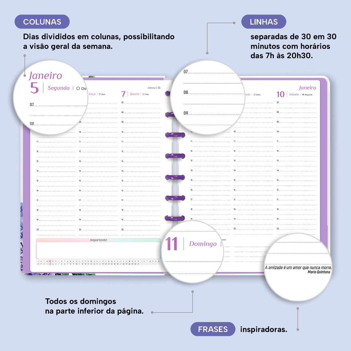 Os dias são divididos em colunas, permitindo uma visão geral da semana, onde você mesmo irá indicar o dia, a semana, o mês e o ano. Assim, você pode utilizar o seu planner independentemente do ano em que estivermos. Não é incrível?