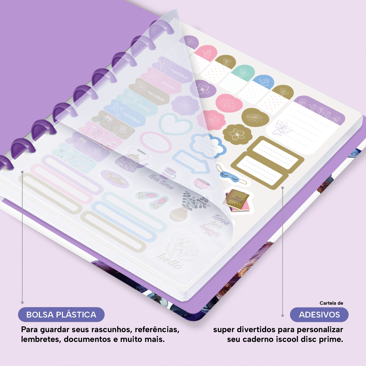 Além de tudo isso, o ISCOOL DISC Planner Datado conta com detalhes que fazem toda a diferença: elástico para fechamento da capa, proporcionando muito mais estilo e privacidade para suas anotações; e uma cartela de adesivos incríveis para que você possa personalizar o planner do seu jeitinho!