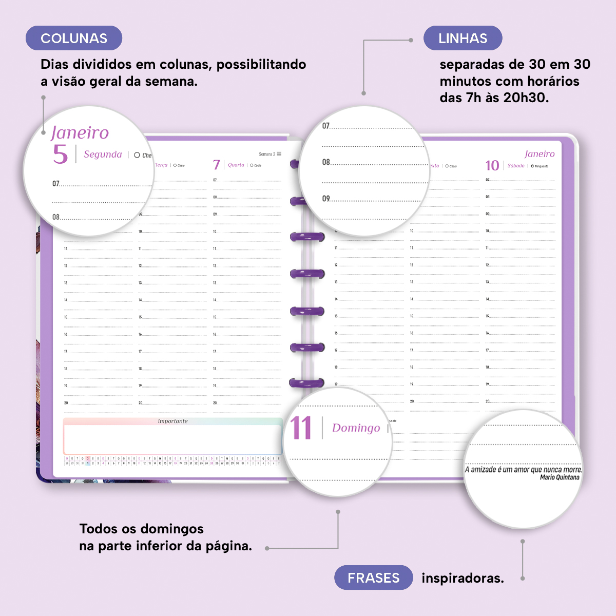 Os dias são divididos em colunas, permitindo uma visão geral da semana, onde você mesmo irá indicar o dia, a semana, o mês e o ano. Assim, você pode utilizar o seu planner independentemente do ano em que estivermos. Não é incrível?