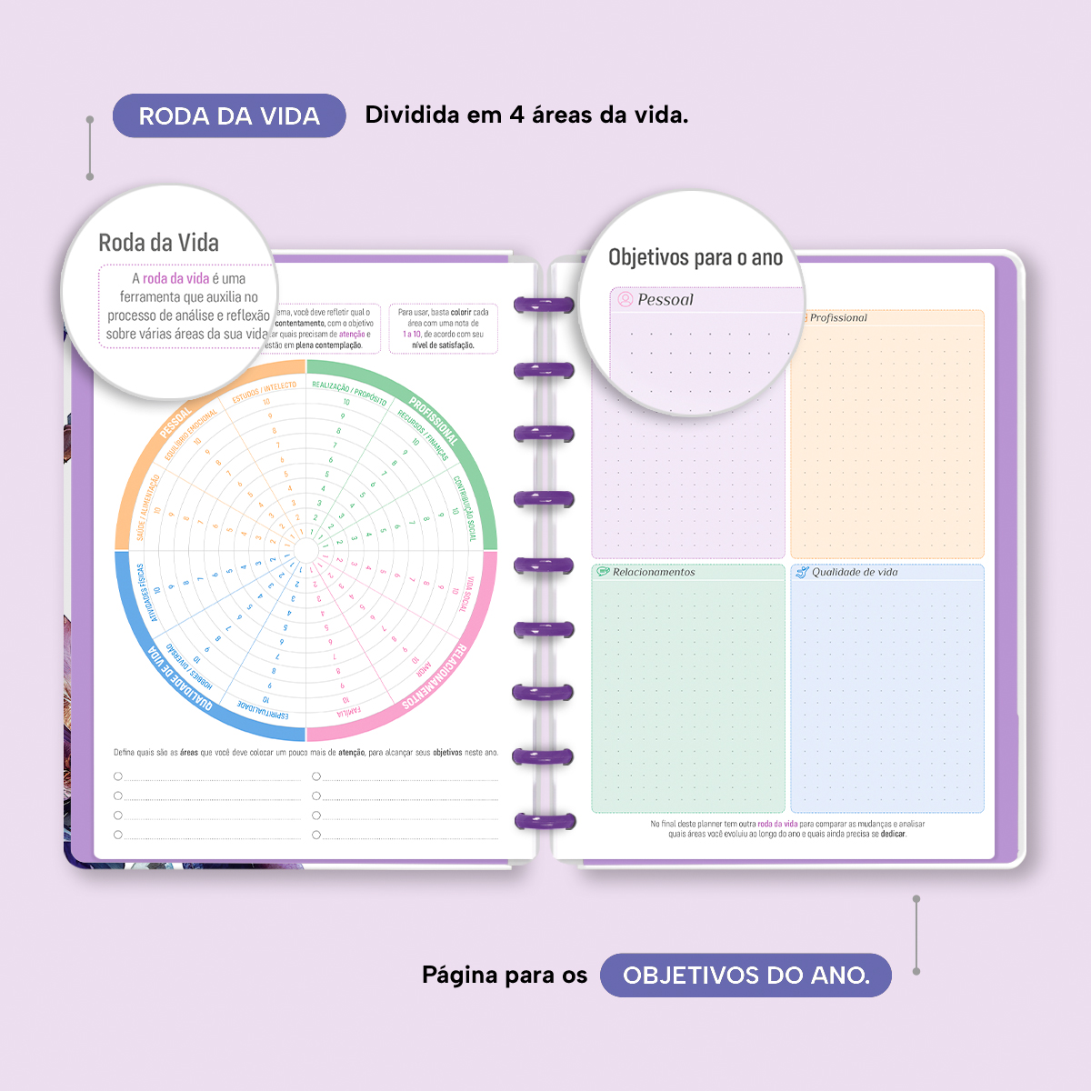 No início de cada mês, há um planejamento mensal, facilitando visualmente as suas principais anotações, um "Habit Tracker" para você desenvolver novos hábitos ou controlar os mais importantes, e ainda um planejamento financeiro, facilitando o controle das suas receitas e despesas, além de inúmeras outras funcionalidades.
