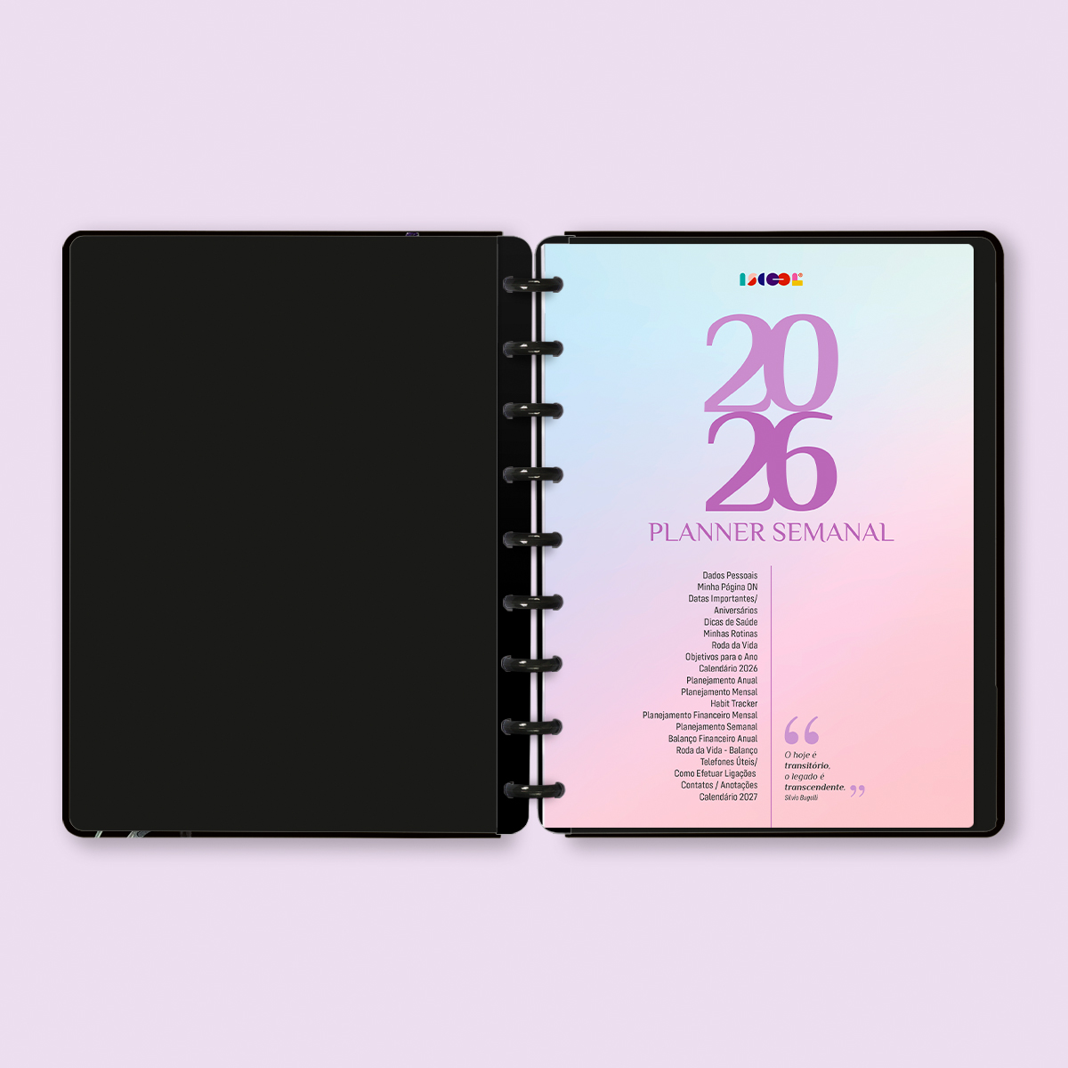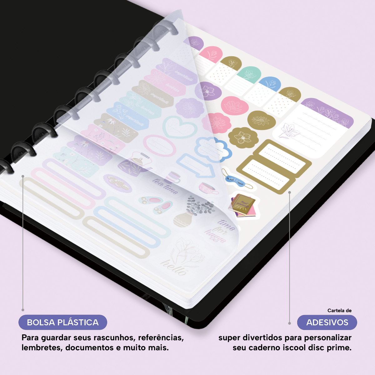 Além de tudo isso, o ISCOOL DISC Planner Datado conta com detalhes que fazem toda a diferença: elástico para fechamento da capa, proporcionando muito mais estilo e privacidade para suas anotações; e uma cartela de adesivos incríveis para que você possa personalizar o planner do seu jeitinho!
