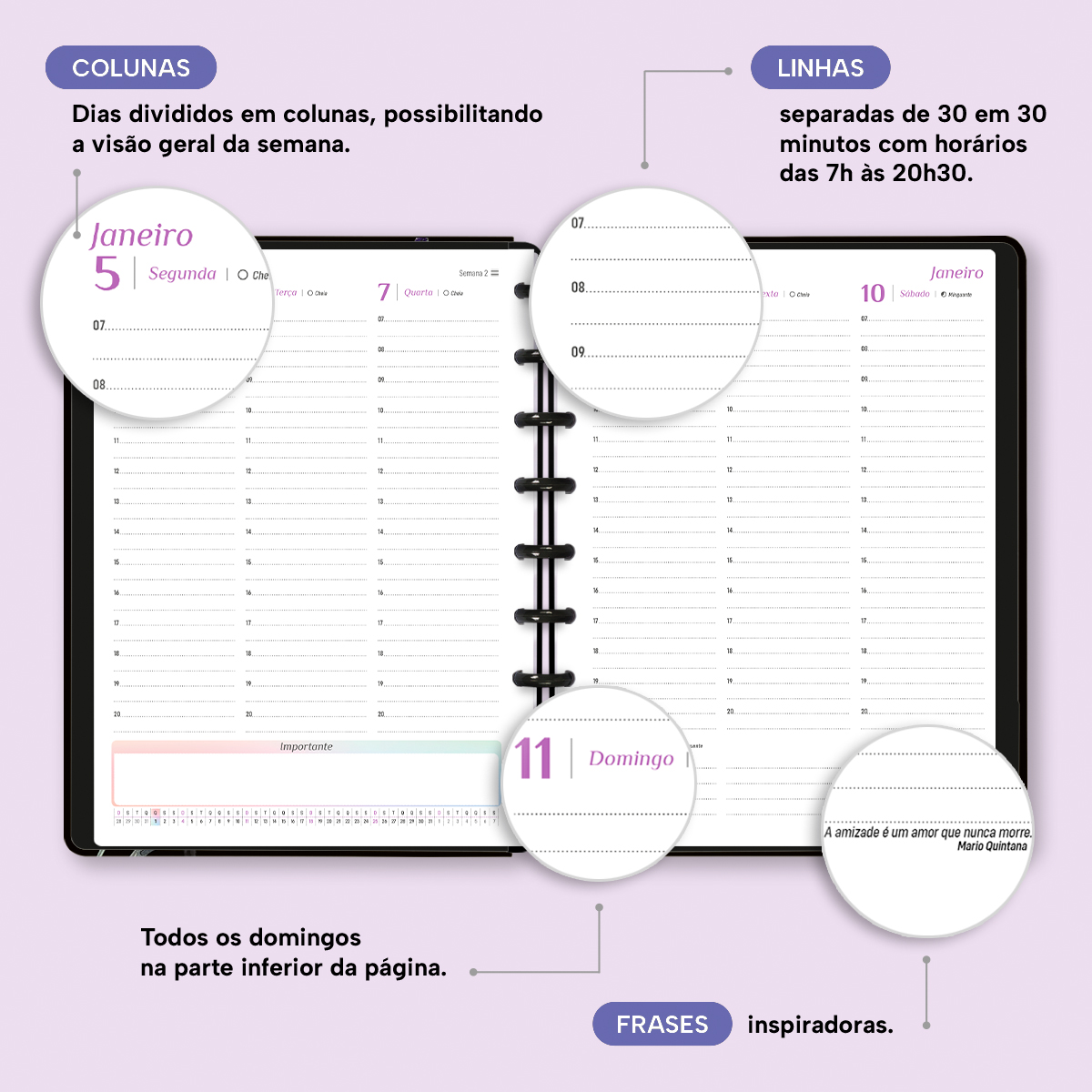 Os dias são divididos em colunas, permitindo uma visão geral da semana, onde você mesmo irá indicar o dia, a semana, o mês e o ano. Assim, você pode utilizar o seu planner independentemente do ano em que estivermos. Não é incrível?