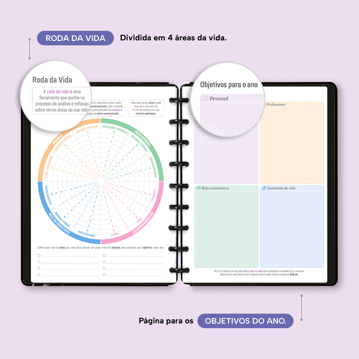 No início de cada mês, há um planejamento mensal, facilitando visualmente as suas principais anotações, um "Habit Tracker" para você desenvolver novos hábitos ou controlar os mais importantes, e ainda um planejamento financeiro, facilitando o controle das suas receitas e despesas, além de inúmeras outras funcionalidades.
