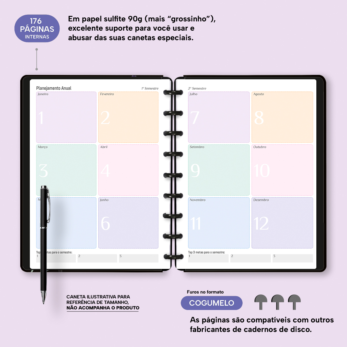 O miolo conta com páginas decoradas em papel sulfite 90g (aquele papel ainda mais "grossinho"), para que você use e abuse das suas canetas especiais. Com furos no formato de "cogumelo", você poderá dar um "up" nele com nossos refis, além de ser compatível com outros fabricantes de cadernos e planners de discos.