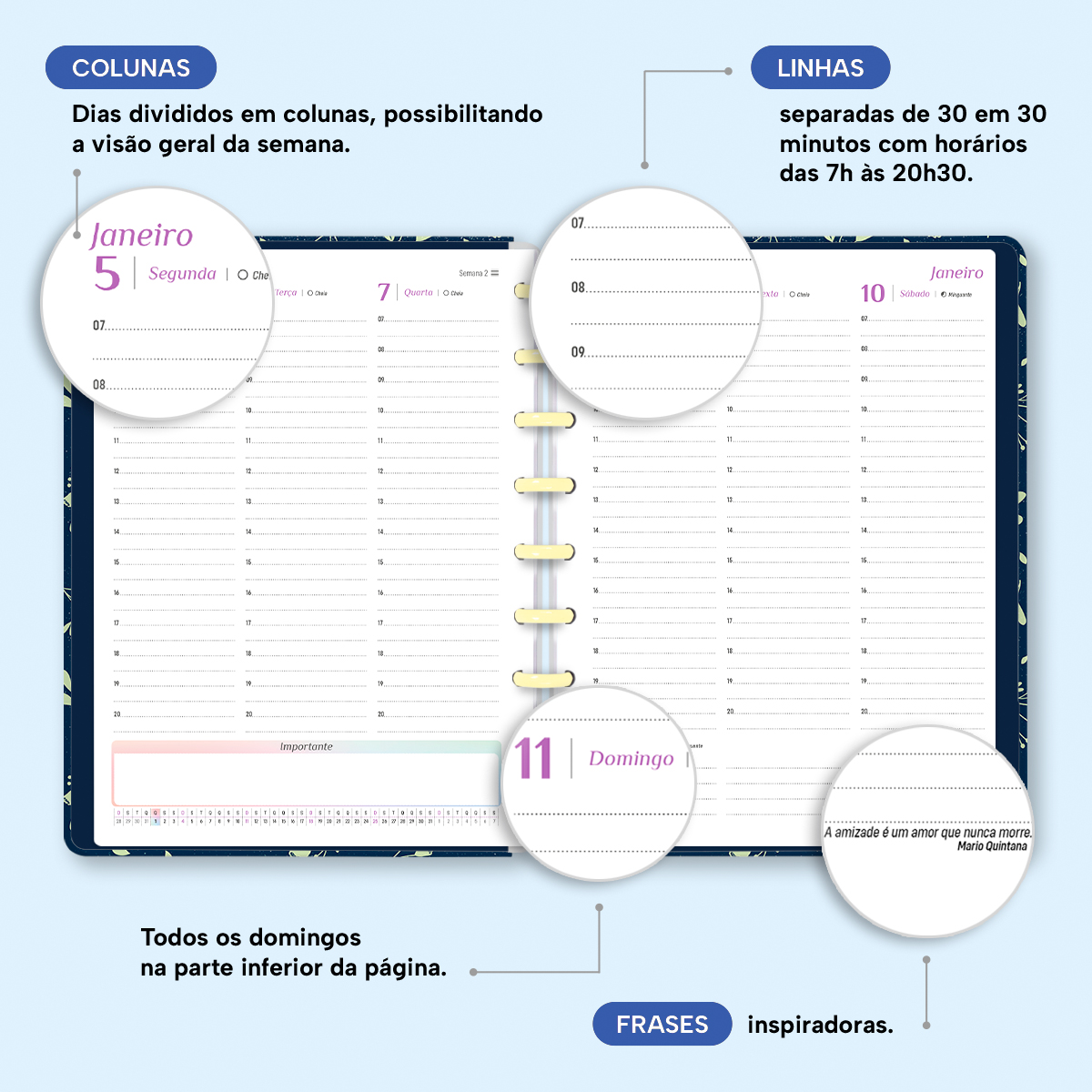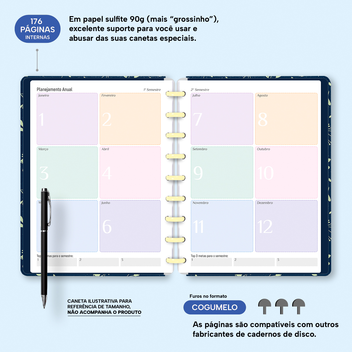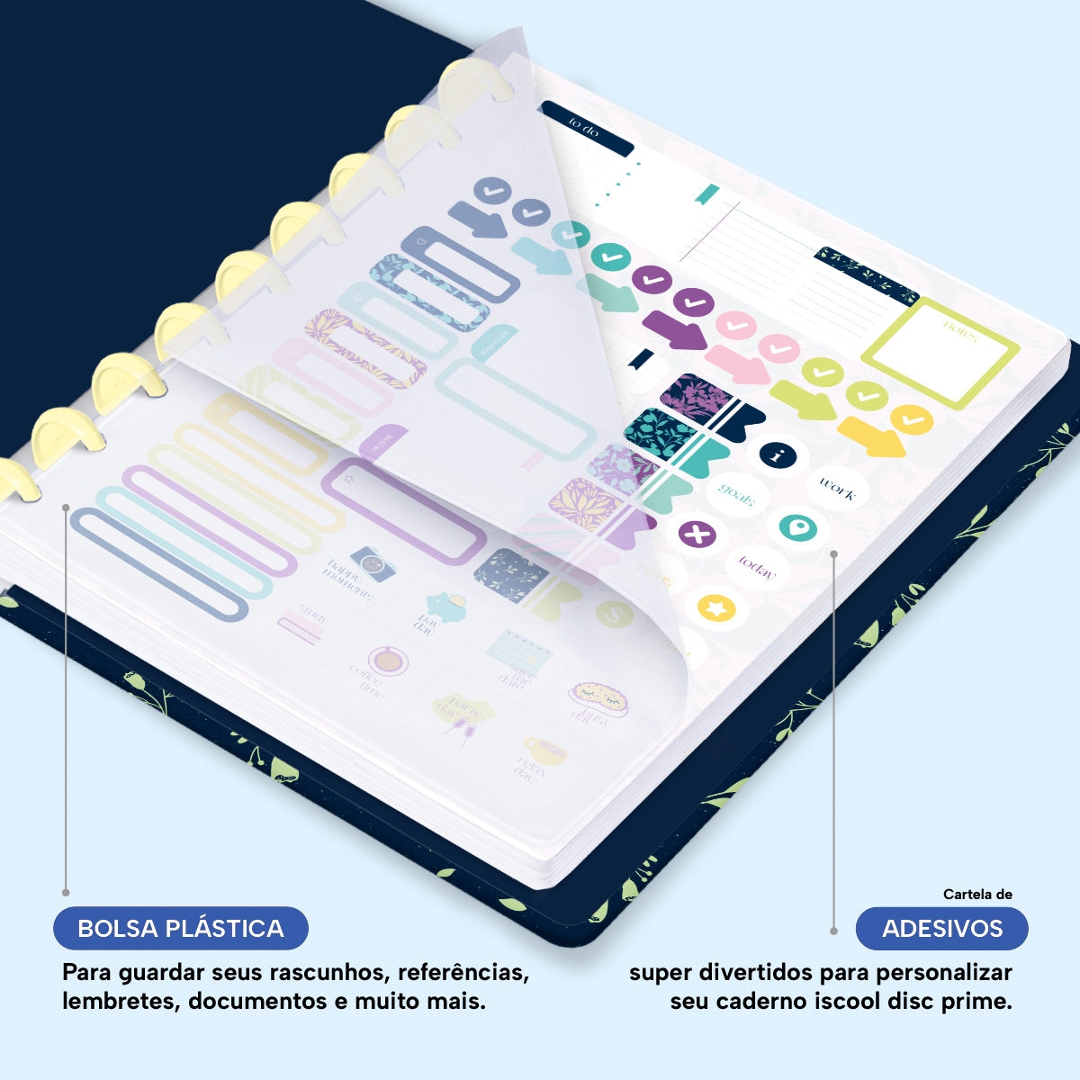 Além de tudo isso, o Iscool Disc Planner Datado 2026 conta com detalhes que fazem toda a diferença: elástico para fechamento da capa, proporcionando muito mais estilo e privacidade para suas anotações; e uma cartela de adesivos incríveis para que você possa personalizar o planner do seu jeitinho!