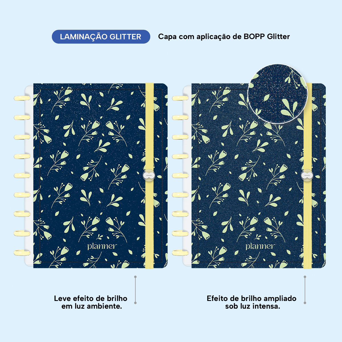 >>> Nosso planner possui um acabamento especial com BOPP glitter que proporciona o efeito de brilho glitter que se destaca sob luz intensa, e o melhor de tudo é que o glitter não solta!
