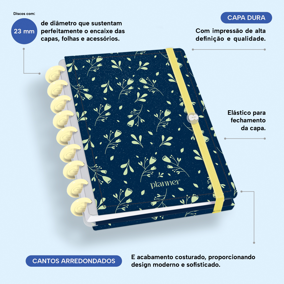 Encadernado com 9 discos M de 23mm em polímero de nylon e/ou policarbonato coloridos, fabricados no Brasil.