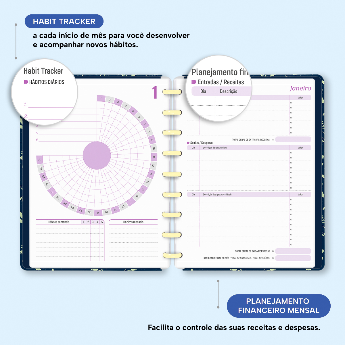 No início de cada mês, há um planejamento mensal, facilitando visualmente as suas principais anotações, um "Habit Tracker" para você desenvolver novos hábitos ou controlar os mais importantes, e ainda um planejamento financeiro, facilitando o controle das suas receitas e despesas, além de inúmeras outras funcionalidades.
