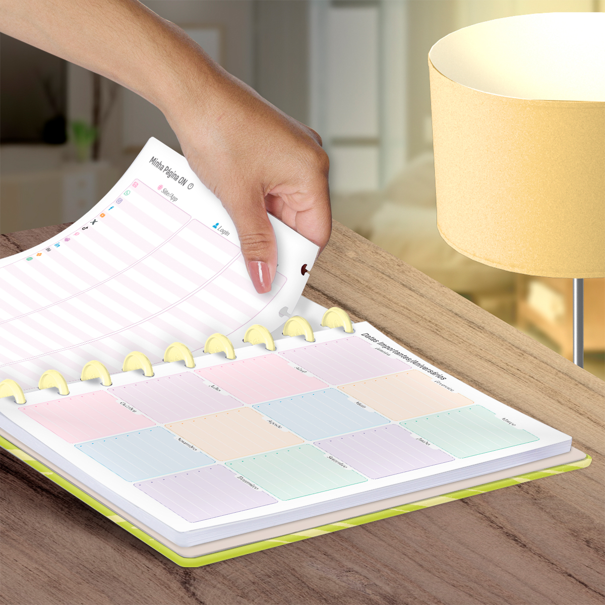 O miolo conta com páginas decoradas em papel sulfite 90g (aquele papel mais "grossinho"), para que você use e abuse das suas canetas especiais. Com furos no formato de "cogumelo", você poderá dar um "up" nele com nossos refis, além de ser compatível com outros fabricantes de cadernos e planners de discos.
