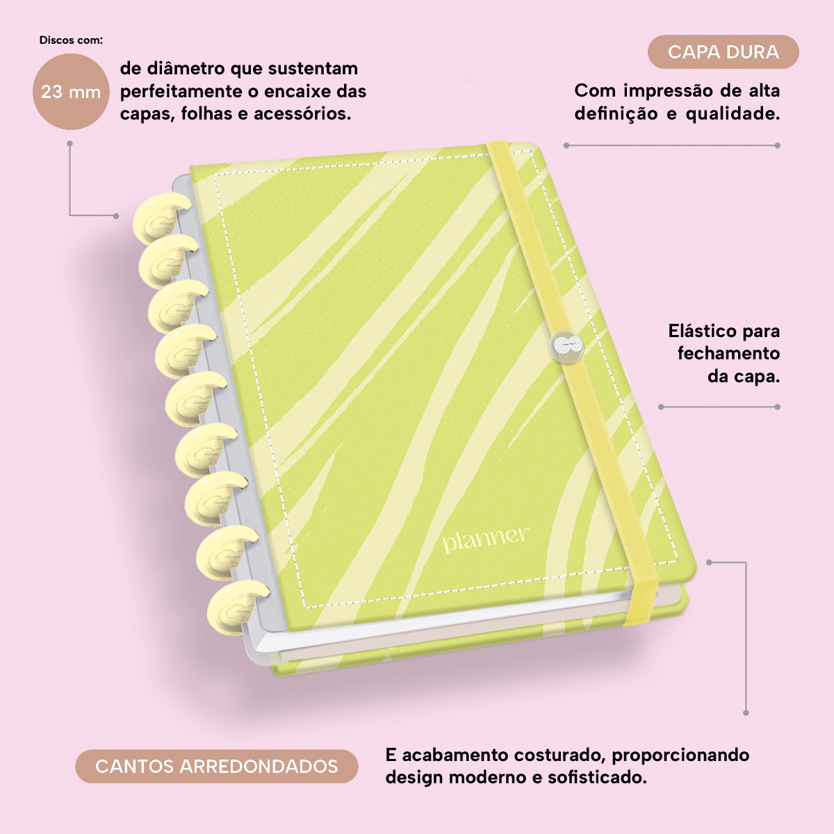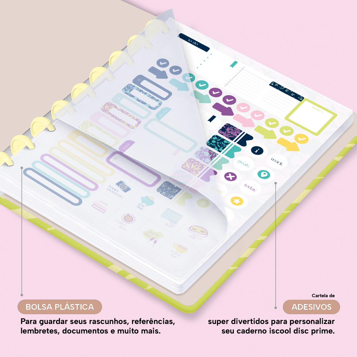 Além de tudo isso, o Iscool Disc Planner Datado 2026 conta com detalhes que fazem toda a diferença: elástico para fechamento da capa, proporcionando muito mais estilo e privacidade para suas anotações; e uma cartela de adesivos incríveis para que você possa personalizar o planner do seu jeitinho!