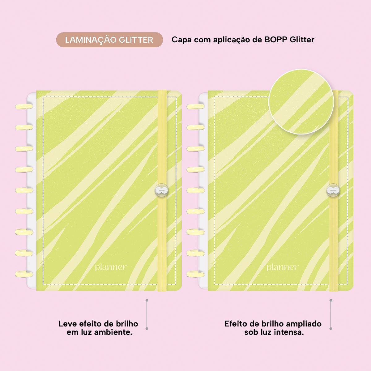 >>> Nosso planner possui um acabamento especial com BOPP glitter que proporciona o efeito de brilho glitter que se destaca sob luz intensa, e o melhor de tudo é que o glitter não solta!