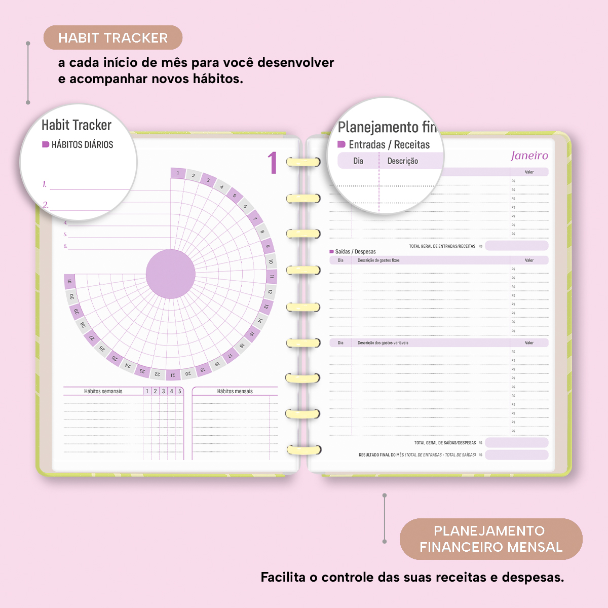 No início de cada mês, há um planejamento mensal, facilitando visualmente as suas principais anotações, um "Habit Tracker" para você desenvolver novos hábitos ou controlar os mais importantes, e ainda um planejamento financeiro, facilitando o controle das suas receitas e despesas, além de inúmeras outras funcionalidades.