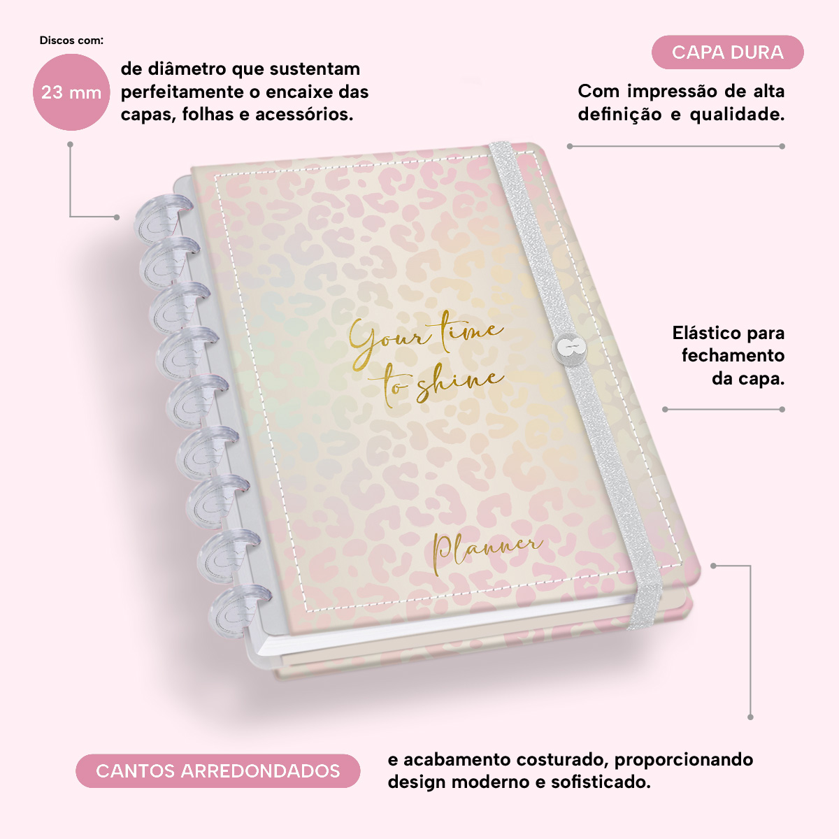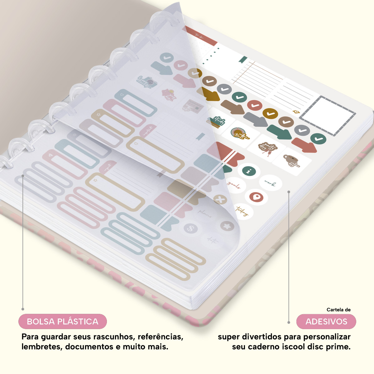 Além de tudo isso, o Iscool Disc Planner Datado 2026 conta com detalhes que fazem toda a diferença: elástico para fechamento da capa, proporcionando muito mais estilo e privacidade para suas anotações; e uma cartela de adesivos incríveis para que você possa personalizar o planner do seu jeitinho!