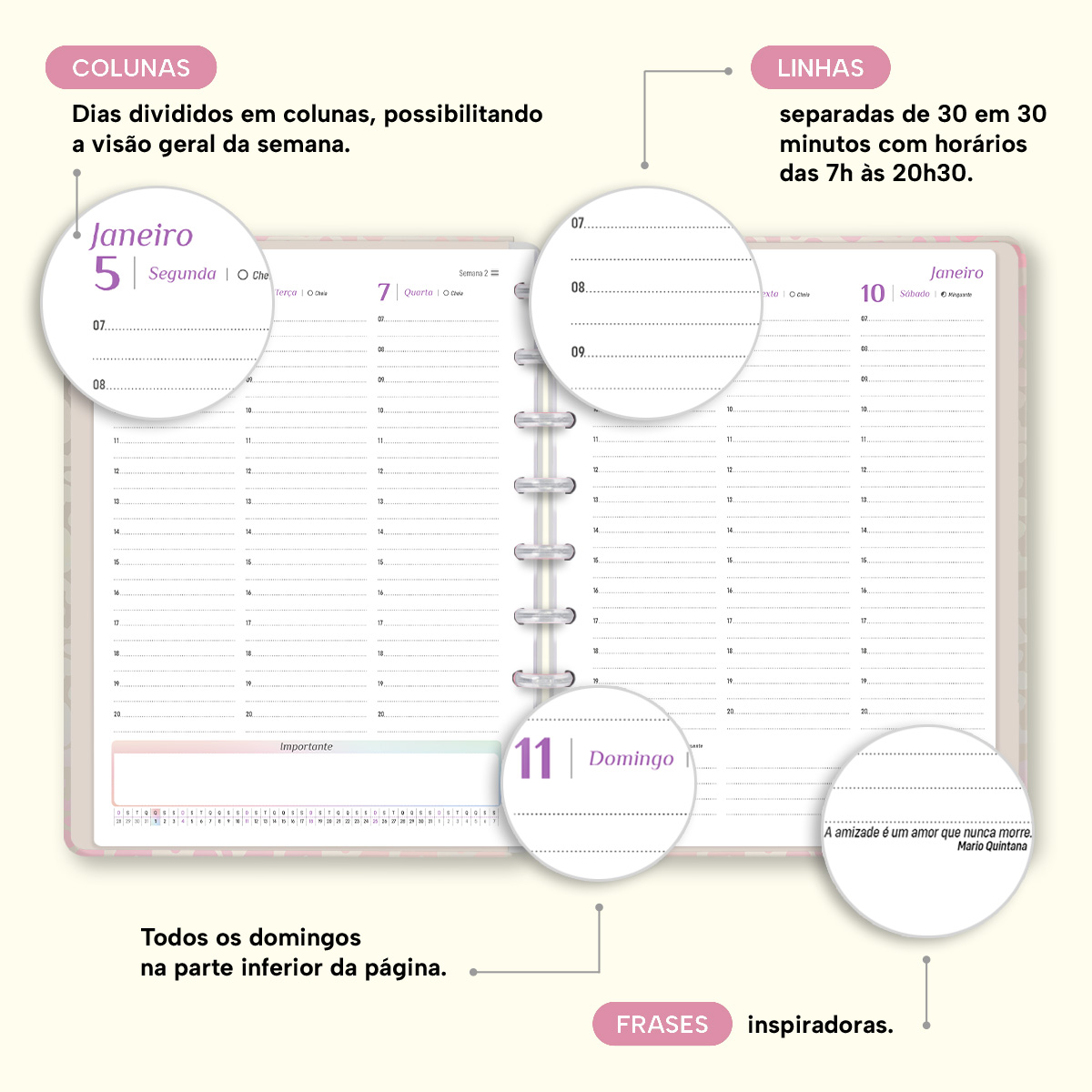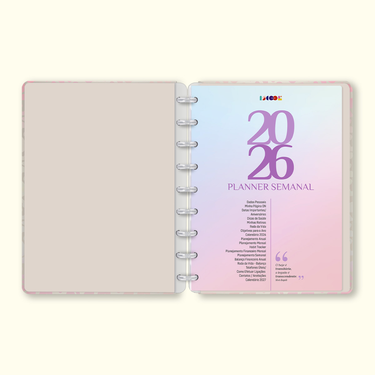 O Iscool Disc Planner Datado 2026 foi criado especialmente para ajudar você a alcançar todas as suas metas e objetivos pessoais. É um planner totalmente customizável, no qual os elementos são reposicionáveis. Você pode montá-lo como preferir, deixando sua criatividade fluir livremente.