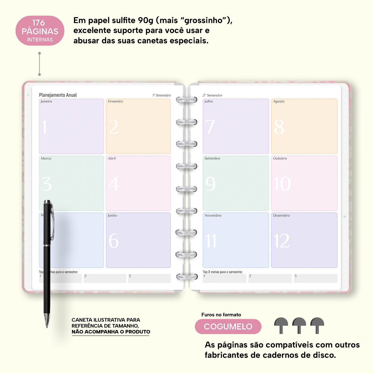 O miolo conta com páginas decoradas em papel sulfite 90g (aquele papel mais "grossinho"), para que você use e abuse das suas canetas especiais. Com furos no formato de "cogumelo", você poderá dar um "up" nele com nossos refis, além de ser compatível com outros fabricantes de cadernos e planners de discos.