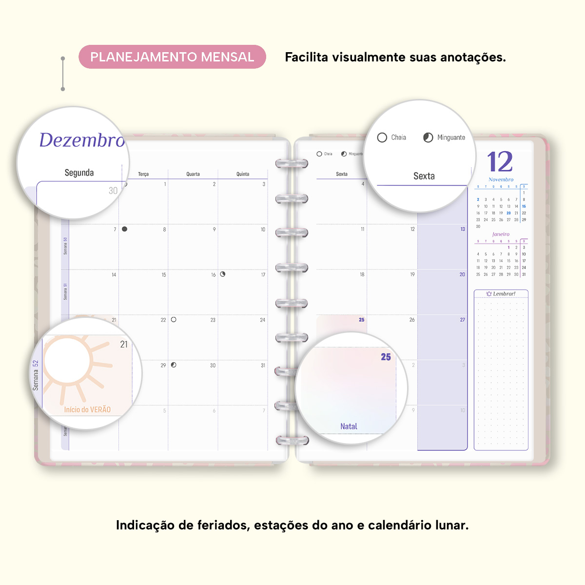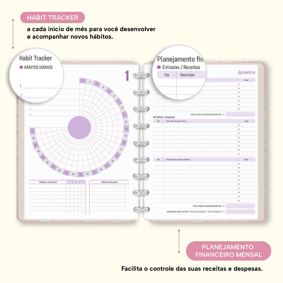 No início de cada mês, há um planejamento mensal, facilitando visualmente as suas principais anotações, um "Habit Tracker" para você desenvolver novos hábitos ou controlar os mais importantes, e ainda um planejamento financeiro, facilitando o controle das suas receitas e despesas, além de inúmeras outras funcionalidades.