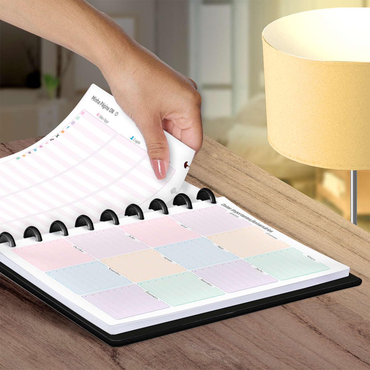 O miolo conta com páginas decoradas em papel sulfite 90g (aquele papel mais "grossinho"), para que você use e abuse das suas canetas especiais. Com furos no formato de "cogumelo", você poderá dar um "up" nele com nossos refis, além de ser compatível com outros fabricantes de cadernos e planners de discos.