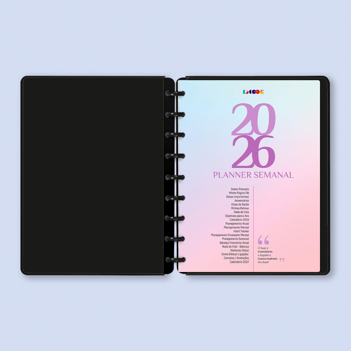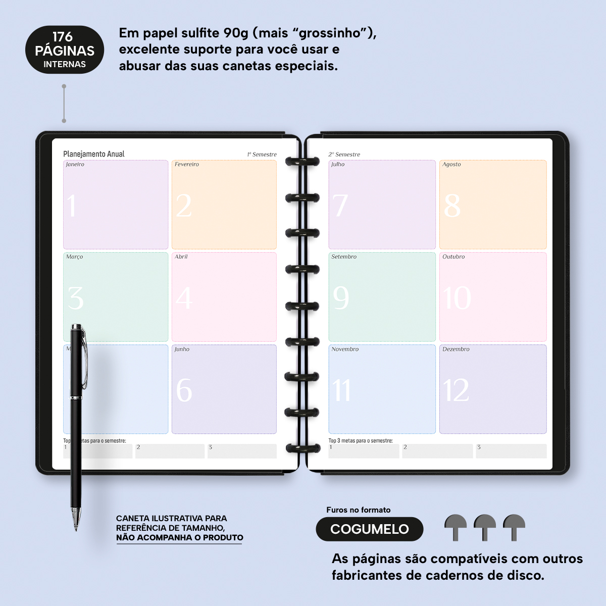 O Iscool Disc Planner Datado 2026 foi criado especialmente para ajudar você a alcançar todas as suas metas e objetivos pessoais. É um planner totalmente customizável, no qual os elementos são reposicionáveis. Você pode montá-lo como preferir, deixando sua criatividade fluir livremente.