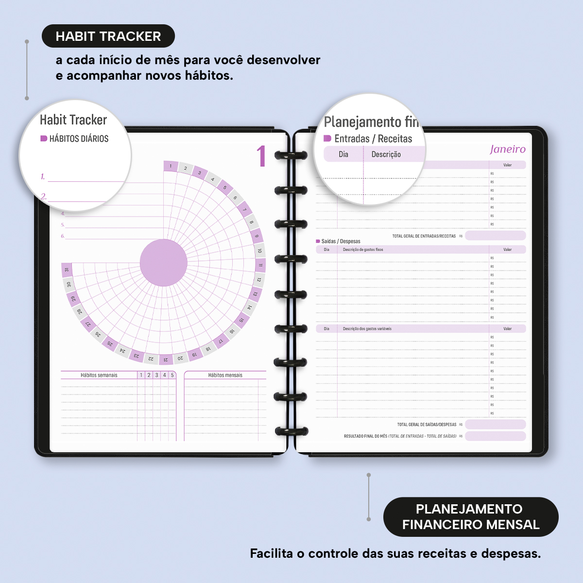 No início de cada mês, há um planejamento mensal, facilitando visualmente as suas principais anotações, um "Habit Tracker" para você desenvolver novos hábitos ou controlar os mais importantes, e ainda um planejamento financeiro, facilitando o controle das suas receitas e despesas, além de inúmeras outras funcionalidades.