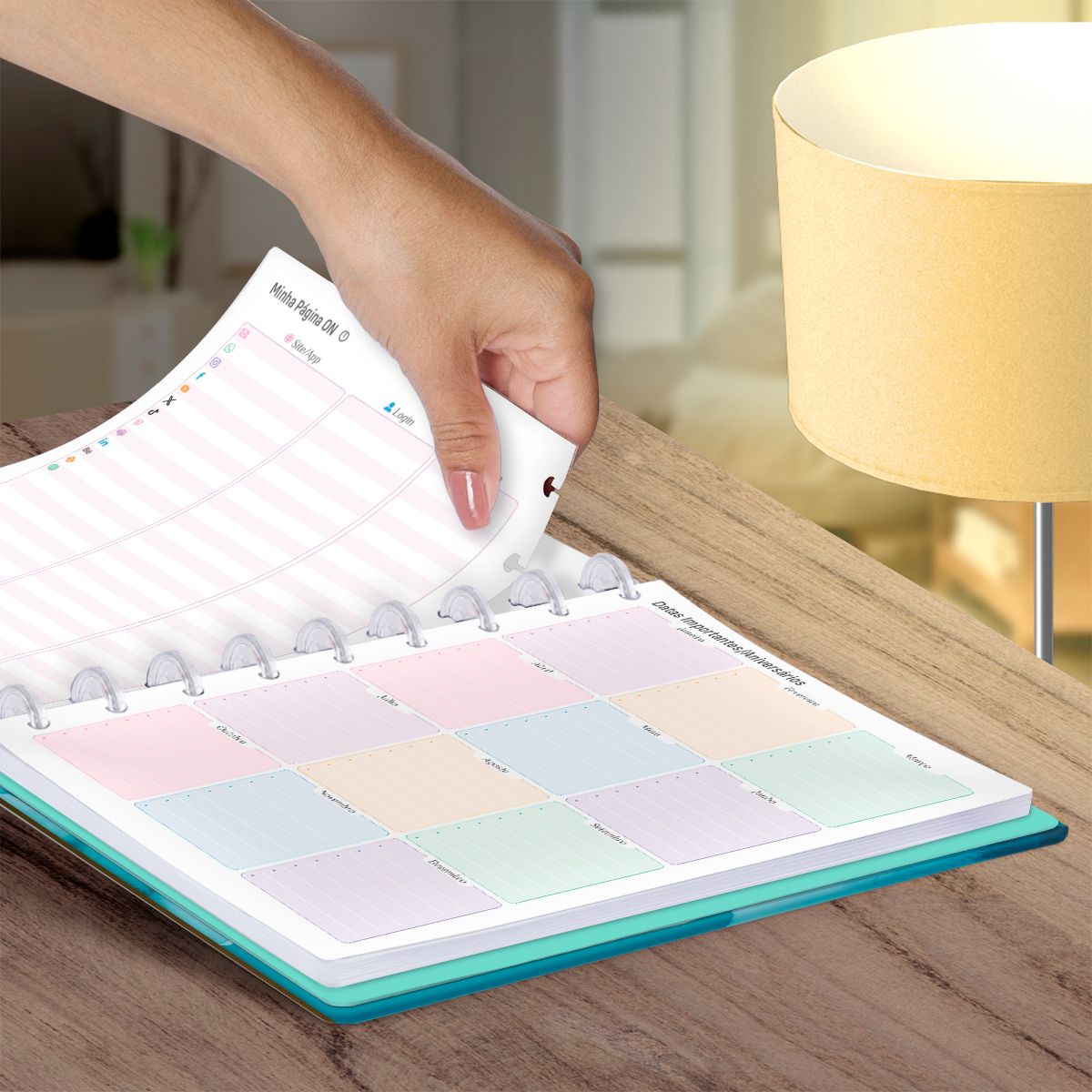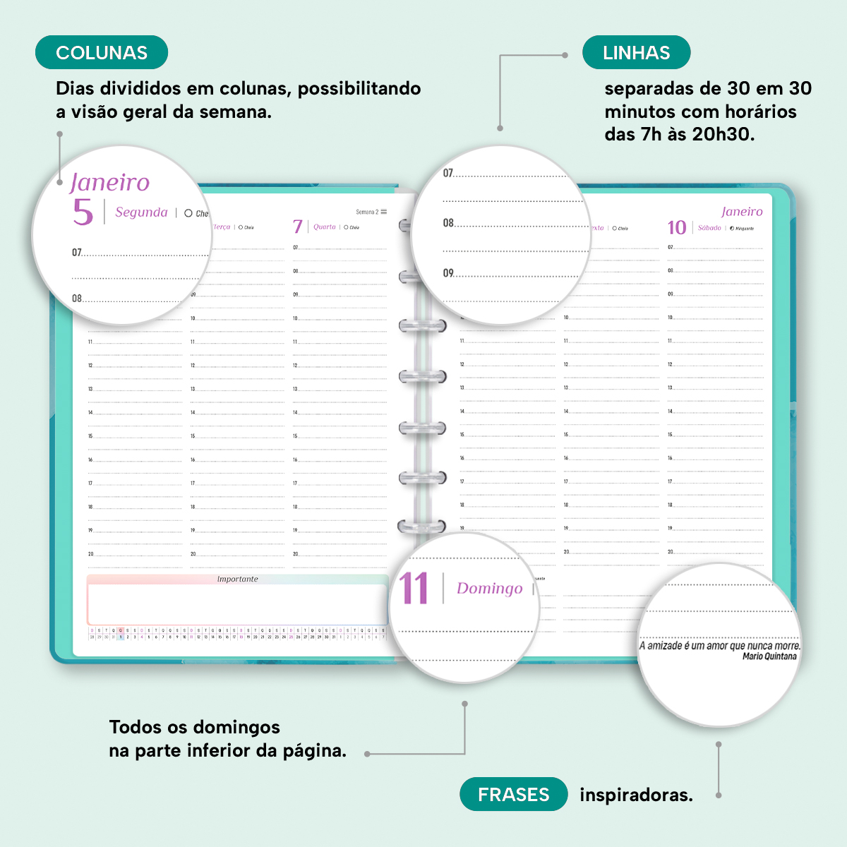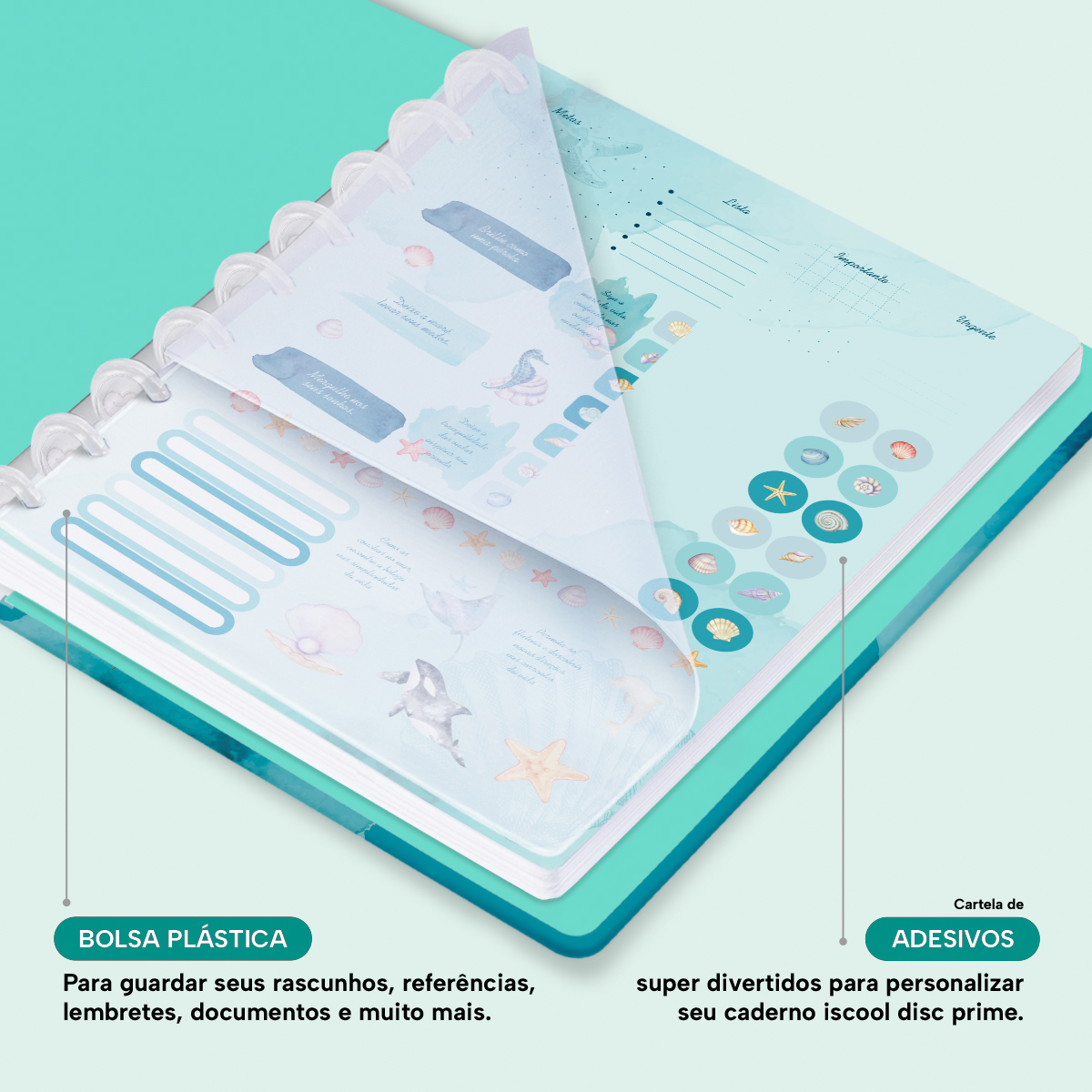 Além de tudo isso, o Iscool Disc Planner Datado 2026 conta com detalhes que fazem toda a diferença: elástico para fechamento da capa, proporcionando muito mais estilo e privacidade para suas anotações; e uma cartela de adesivos incríveis para que você possa personalizar o planner do seu jeitinho!
