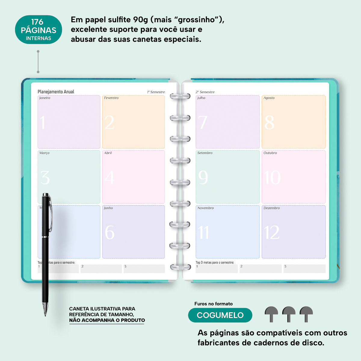 O miolo conta com páginas decoradas em papel sulfite 90g (aquele papel mais "grossinho"), para que você use e abuse das suas canetas especiais. Com furos no formato de "cogumelo", você poderá dar um "up" nele com nossos refis, além de ser compatível com outros fabricantes de cadernos e planners de discos.