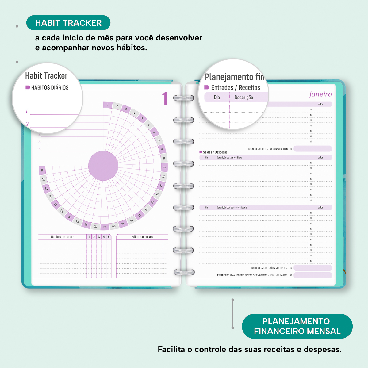 No início de cada mês, há um planejamento mensal, facilitando visualmente as suas principais anotações, um "Habit Tracker" para você desenvolver novos hábitos ou controlar os mais importantes, e ainda um planejamento financeiro, facilitando o controle das suas receitas e despesas, além de inúmeras outras funcionalidades.