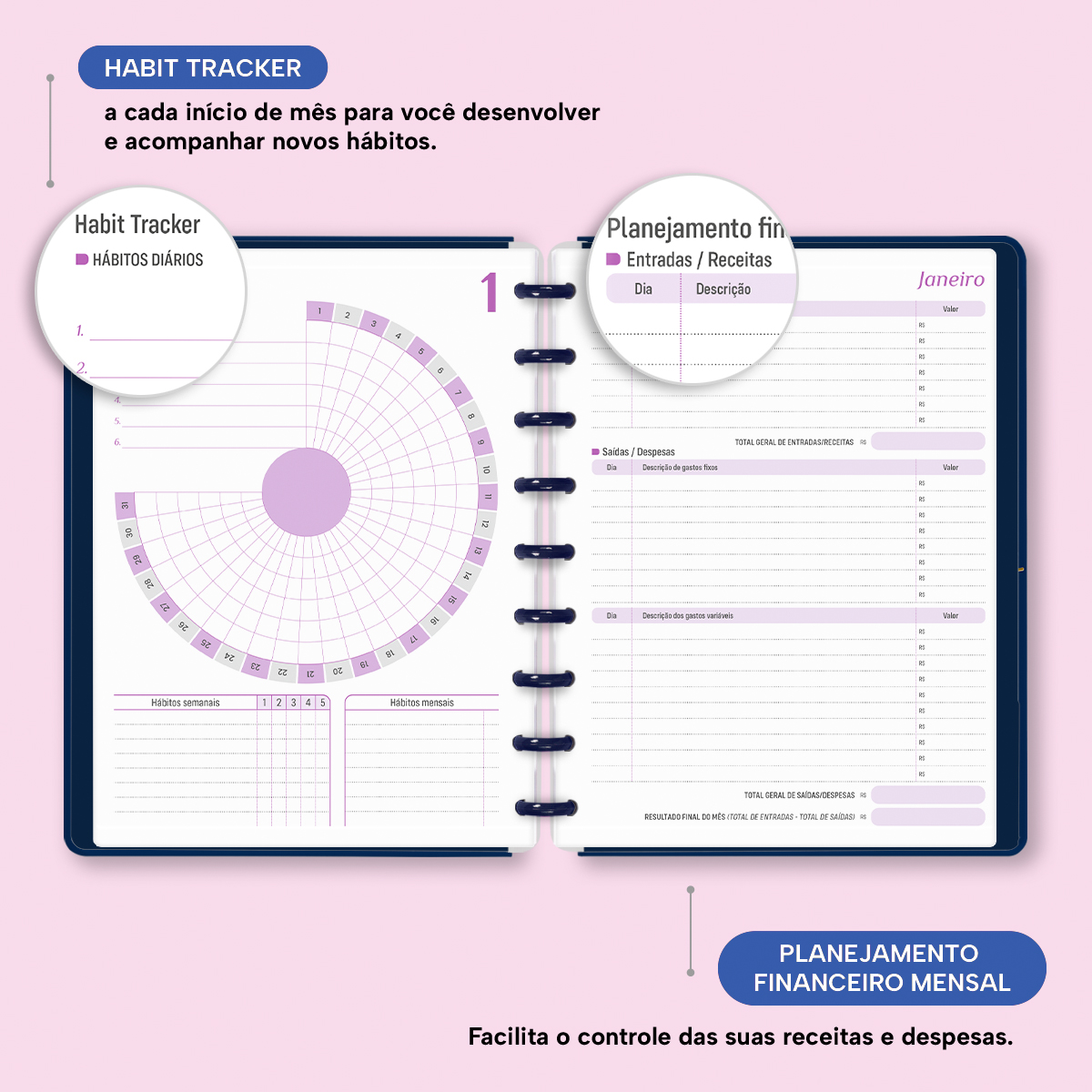 No início de cada mês, há um planejamento mensal, facilitando visualmente as suas principais anotações, um "Habit Tracker" para você desenvolver novos hábitos ou controlar os mais importantes, e ainda um planejamento financeiro, facilitando o controle das suas receitas e despesas, além de inúmeras outras funcionalidades.