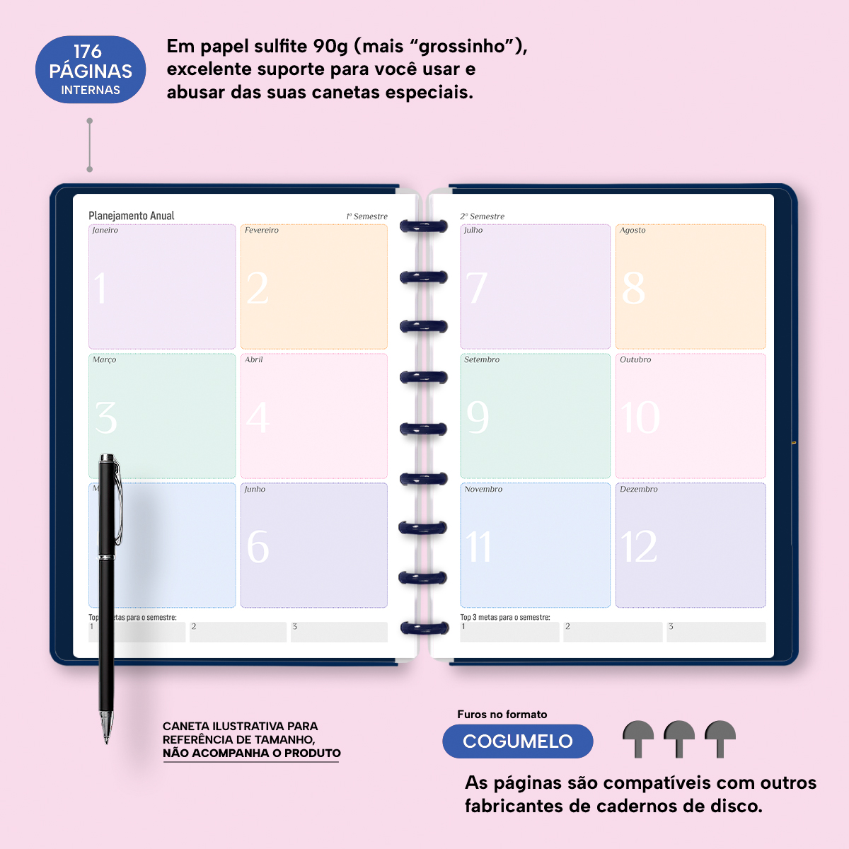 O miolo conta com páginas decoradas em papel sulfite 90g (aquele papel mais "grossinho"), para que você use e abuse das suas canetas especiais. Com furos no formato de "cogumelo", você poderá dar um "up" nele com nossos refis, além de ser compatível com outros fabricantes de cadernos e planners de discos.