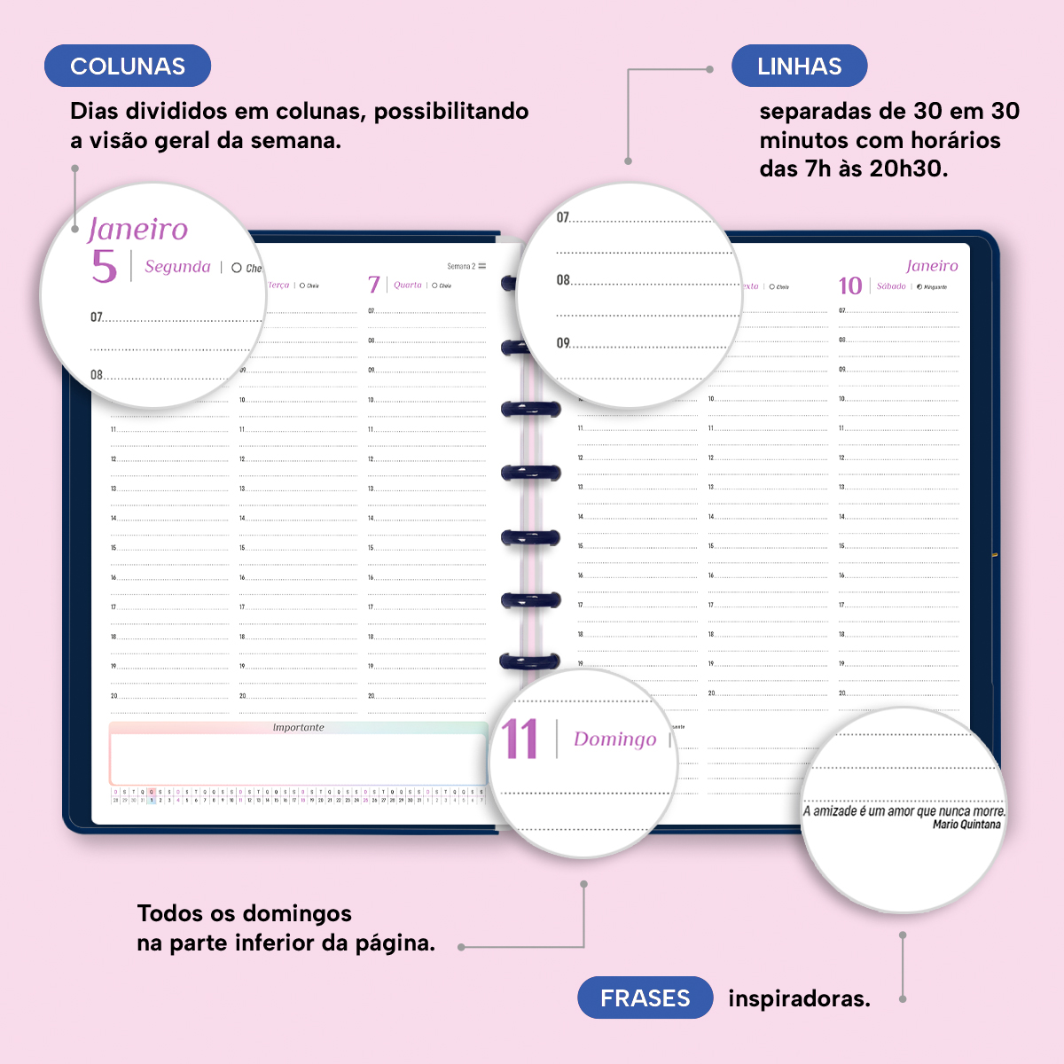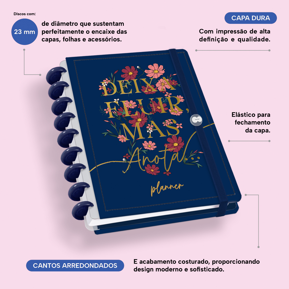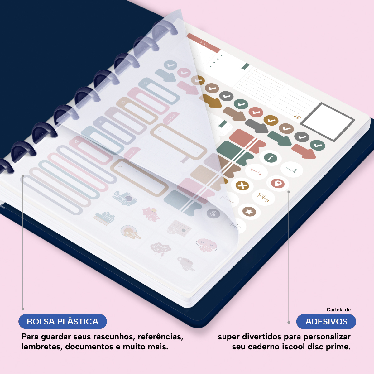 Além de tudo isso, o Iscool Disc Planner Datado 2026 conta com detalhes que fazem toda a diferença: elástico para fechamento da capa, proporcionando muito mais estilo e privacidade para suas anotações; e uma cartela de adesivos incríveis para que você possa personalizar o planner do seu jeitinho!