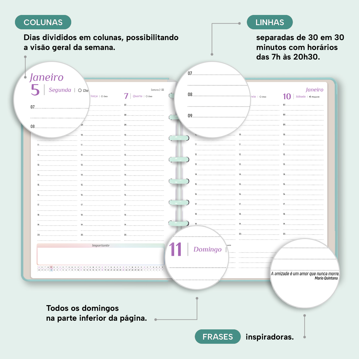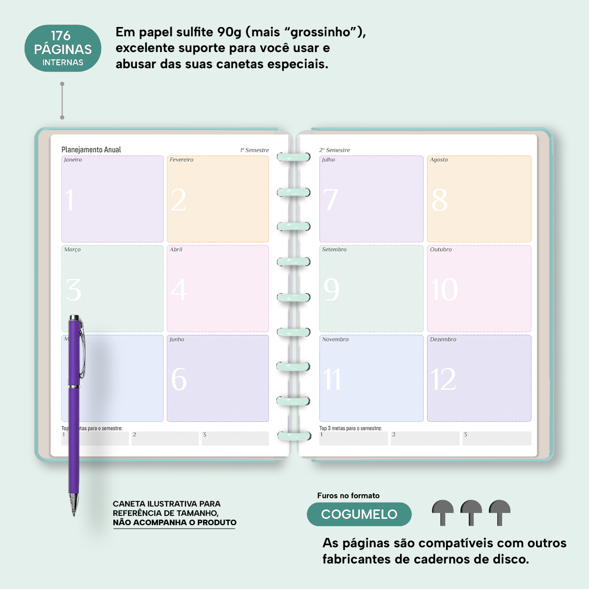 O Iscool Disc Planner Datado 2026 foi criado especialmente para ajudar você a alcançar todas as suas metas e objetivos pessoais. É um planner totalmente customizável, no qual os elementos são reposicionáveis. Você pode montá-lo como preferir, deixando sua criatividade fluir livremente.