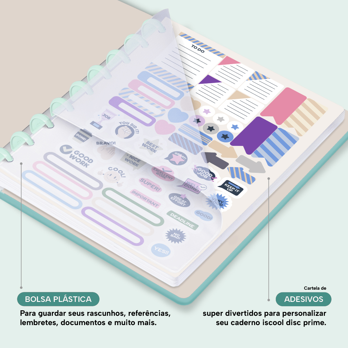 Além de tudo isso, o Iscool Disc Planner Datado 2026 conta com detalhes que fazem toda a diferença: elástico para fechamento da capa, proporcionando muito mais estilo e privacidade para suas anotações; e uma cartela de adesivos incríveis para que você possa personalizar o planner do seu jeitinho!
