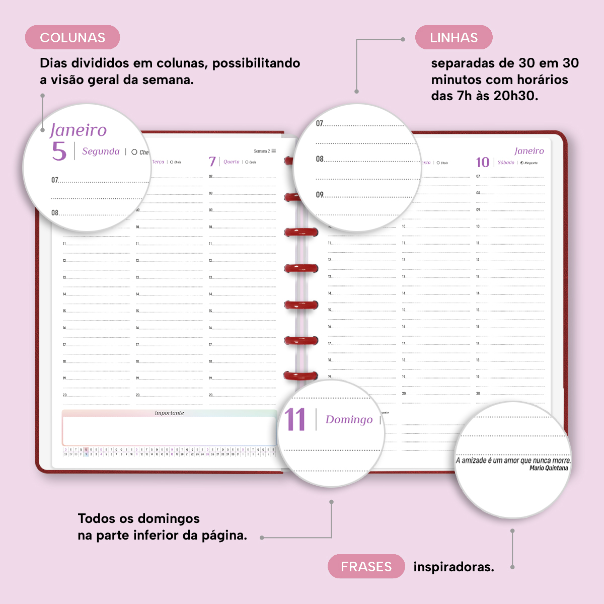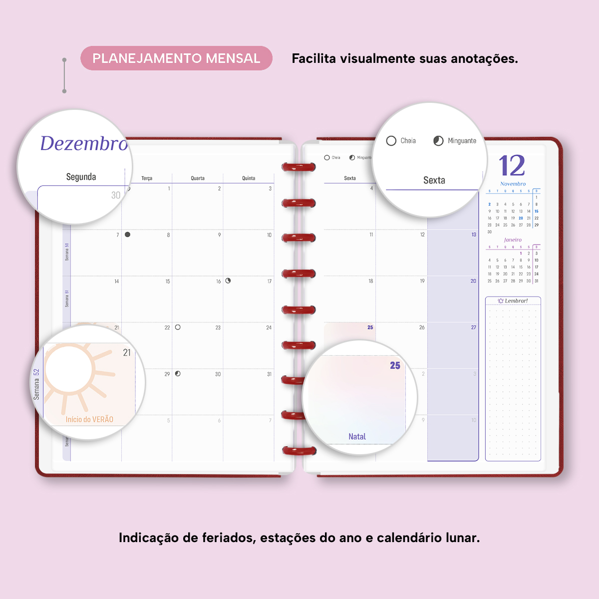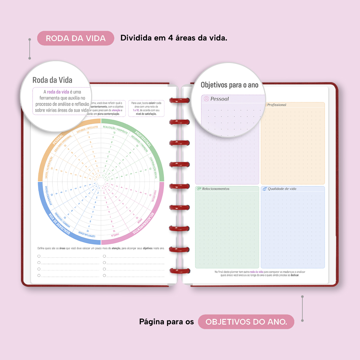 No início de cada mês, há um planejamento mensal, facilitando visualmente as suas principais anotações, um "Habit Tracker" para você desenvolver novos hábitos ou controlar os mais importantes, e ainda um planejamento financeiro, facilitando o controle das suas receitas e despesas, além de inúmeras outras funcionalidades.