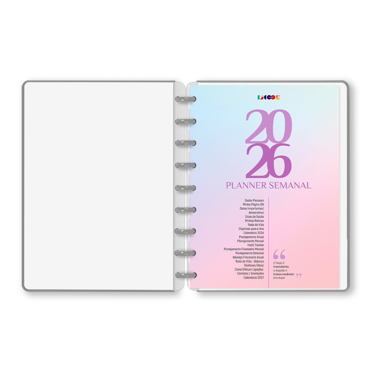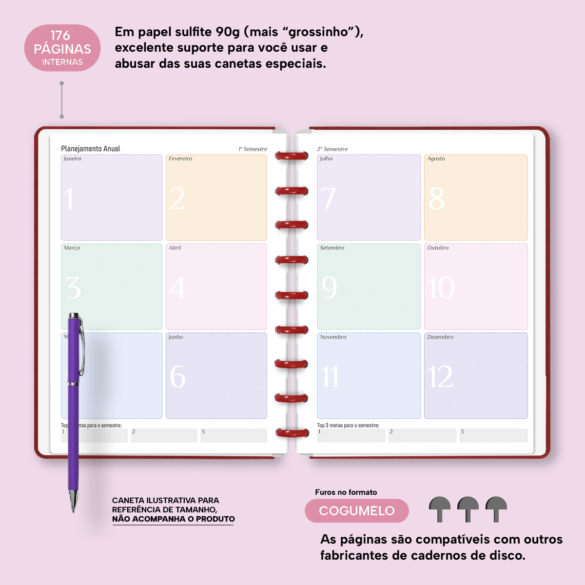 O Iscool Disc Planner Datado 2026 foi criado especialmente para ajudar você a alcançar todas as suas metas e objetivos pessoais. É um planner totalmente customizável, no qual os elementos são reposicionáveis. Você pode montá-lo como preferir, deixando sua criatividade fluir livremente.