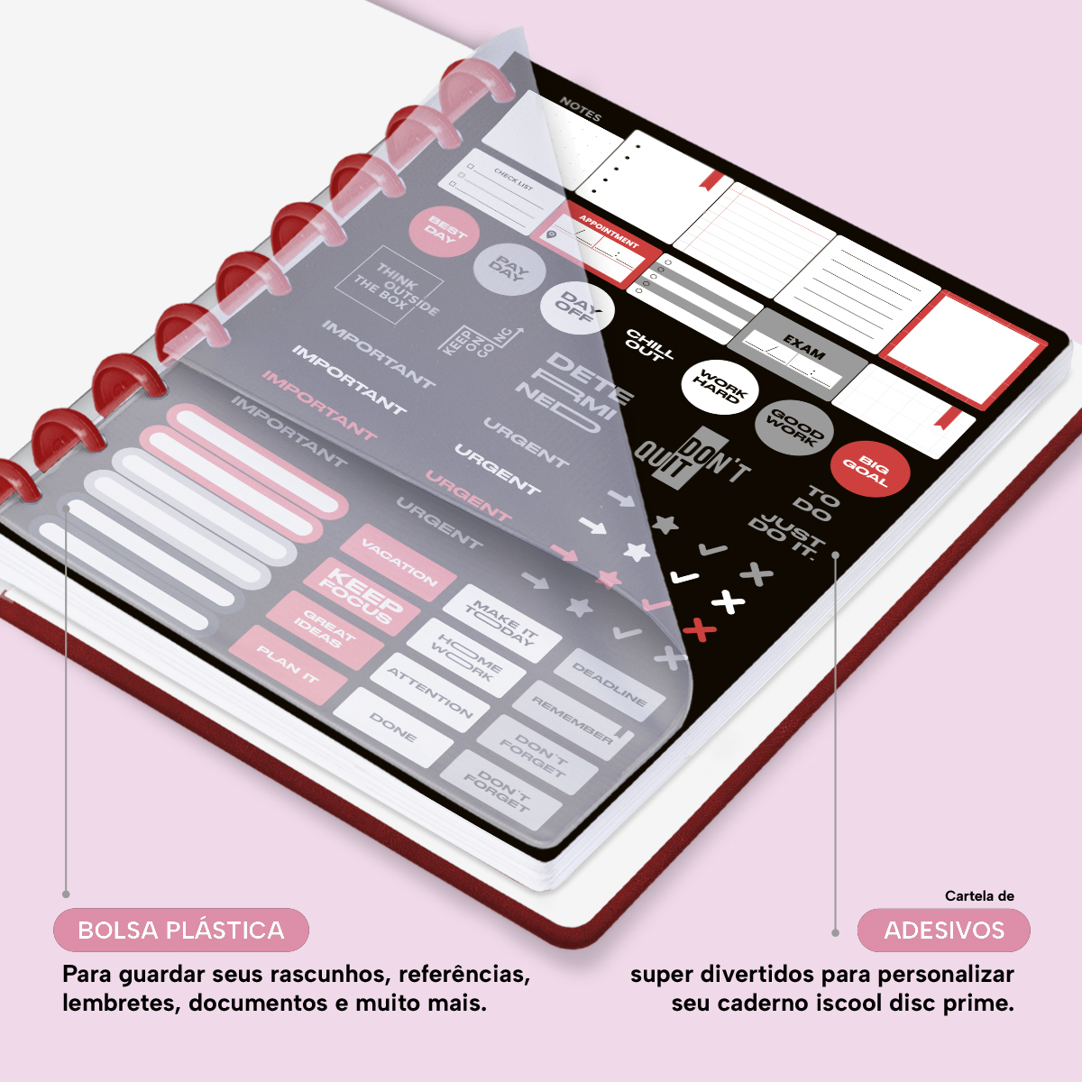 Além de tudo isso, o Iscool Disc Planner Datado 2026 conta com detalhes que fazem toda a diferença: elástico para fechamento da capa, proporcionando muito mais estilo e privacidade para suas anotações; e uma cartela de adesivos incríveis para que você possa personalizar o planner do seu jeitinho!