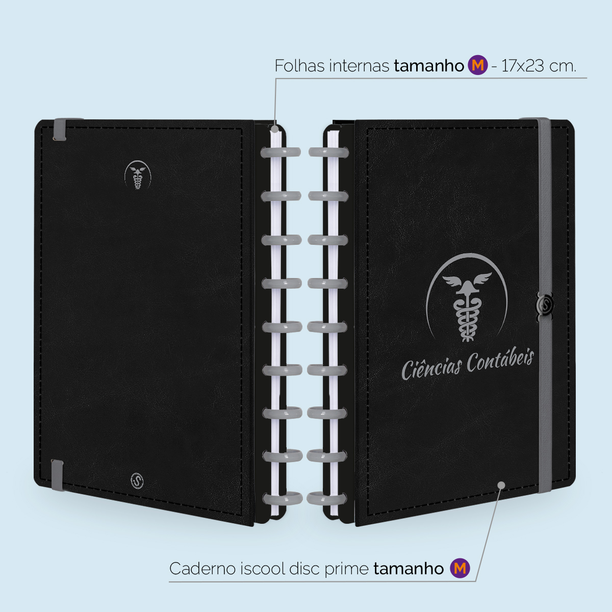 Encadernado com 11 discos M de 23mm em polímero de nylon e/ou policarbonato, fabricados no Brasil.