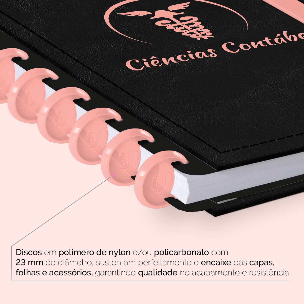 Encadernado com 11 discos M de 23mm em polímero de nylon e/ou policarbonato, fabricados no Brasil.