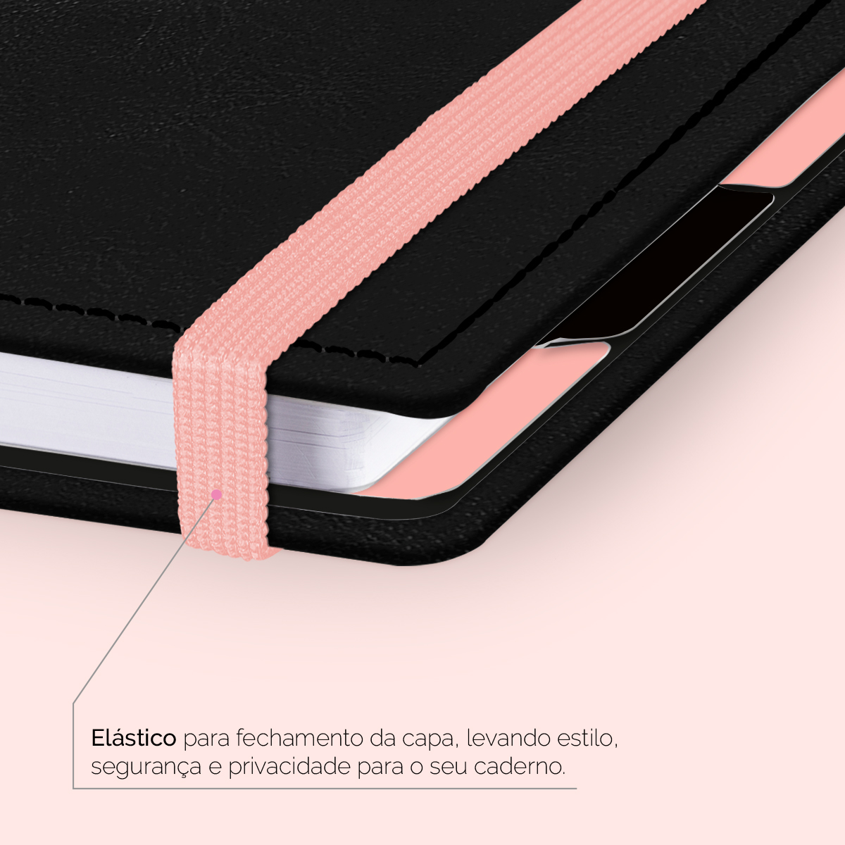 O miolo conta com 30 folhas pautadas em papel sulfite 120g 100% preto (aquele papel ainda mais “grossinho”) para que você use e abuse das suas canetas especiais e 30 folhas pontilhadas black, ideais para explorar seu lado mais criativo ou fazer bullet journal.