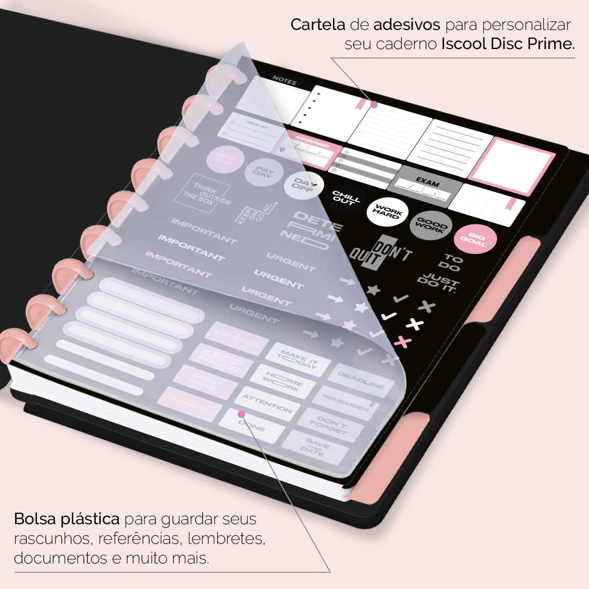 Além de tudo isso, o iscooldisc Prime Blackout, conta com detalhezinhos que fazem toda diferença: elástico para fechamento da capa, muito mais estilo e privacidade para suas anotações; bolsa plástica para guardar seus rascunhos, referências, lembretes, documentos e uma cartela de adesivos incríveis, para que você possa personalizar seu caderno do seu jeitinho!