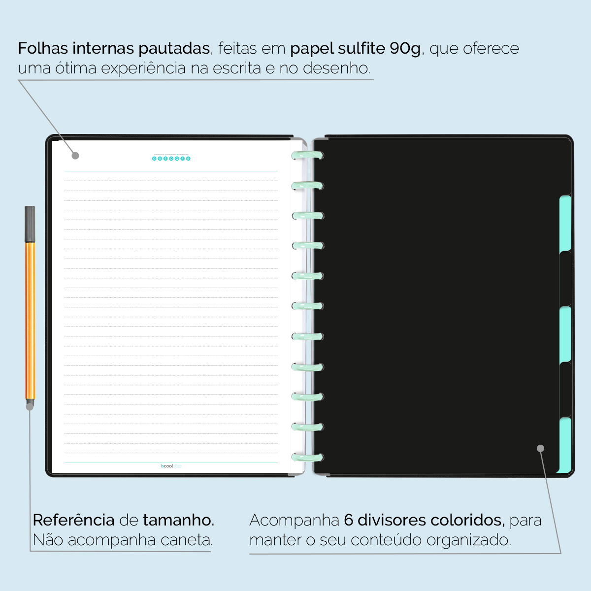 Além de tudo isso, o ISCOOL DISC PRIME, conta com detalhezinhos que fazem toda diferença: elástico para fechamento da capa, muito mais estilo e privacidade para suas anotações; bolsa plástica para guardar seus rascunhos, referências, lembretes, documentos e uma cartela de adesivos incríveis, para que você possa personalizar seu caderno do seu jeitinho!