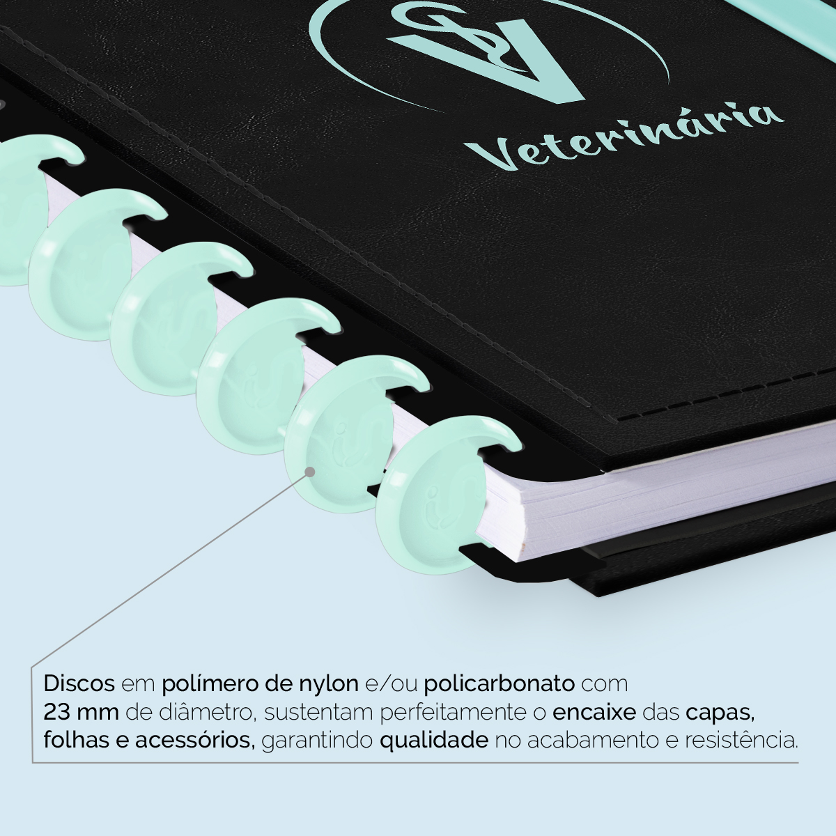 Os nossos discos são fabricados em polímero de nylon e/ou policarbonato, podem ser substituídos, proporcionando imensa variedade na combinação das cores, qualidade no acabamento e eficácia no encaixe das capas, folhas e acessórios.