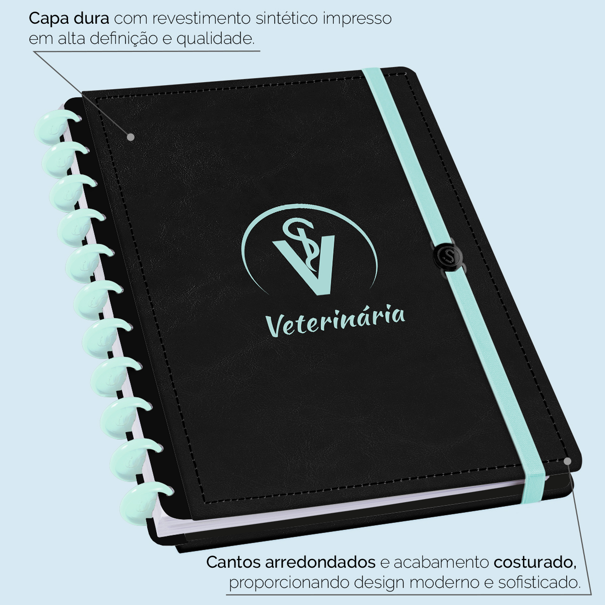Encadernado com 11 discos M de 23mm em polímero de nylon e/ou policarbonato coloridos, fabricados no Brasil.