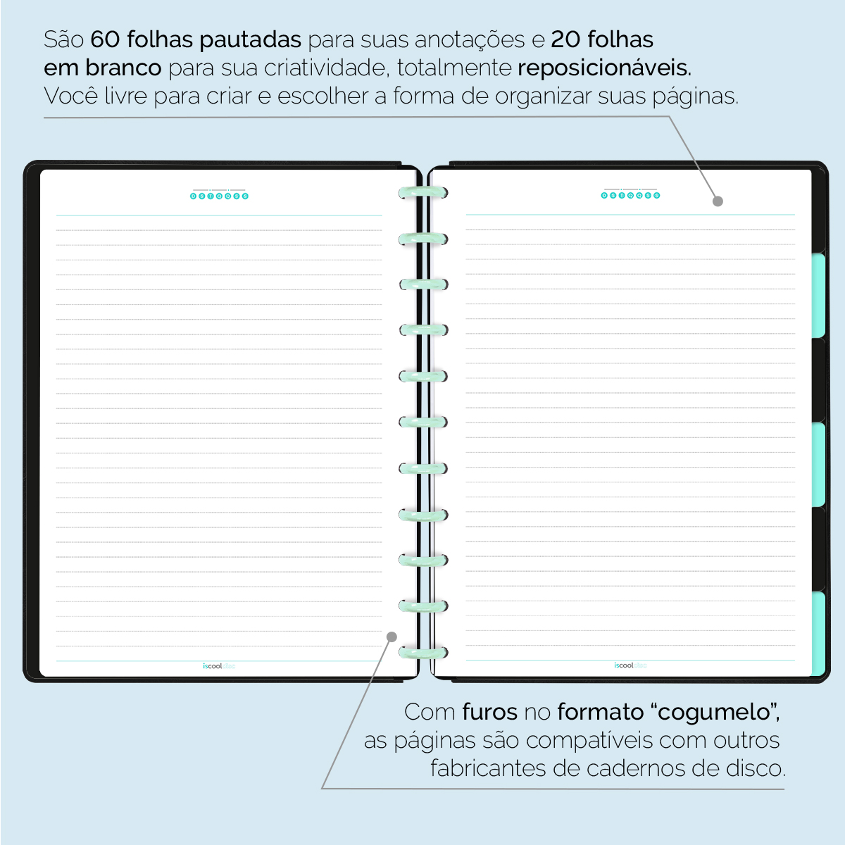 Com furos no formato de “cogumelo”, você poderá dar um “up” em seu caderno com nossos refis, além de ser compatível com outros fabricantes de cadernos de discos.