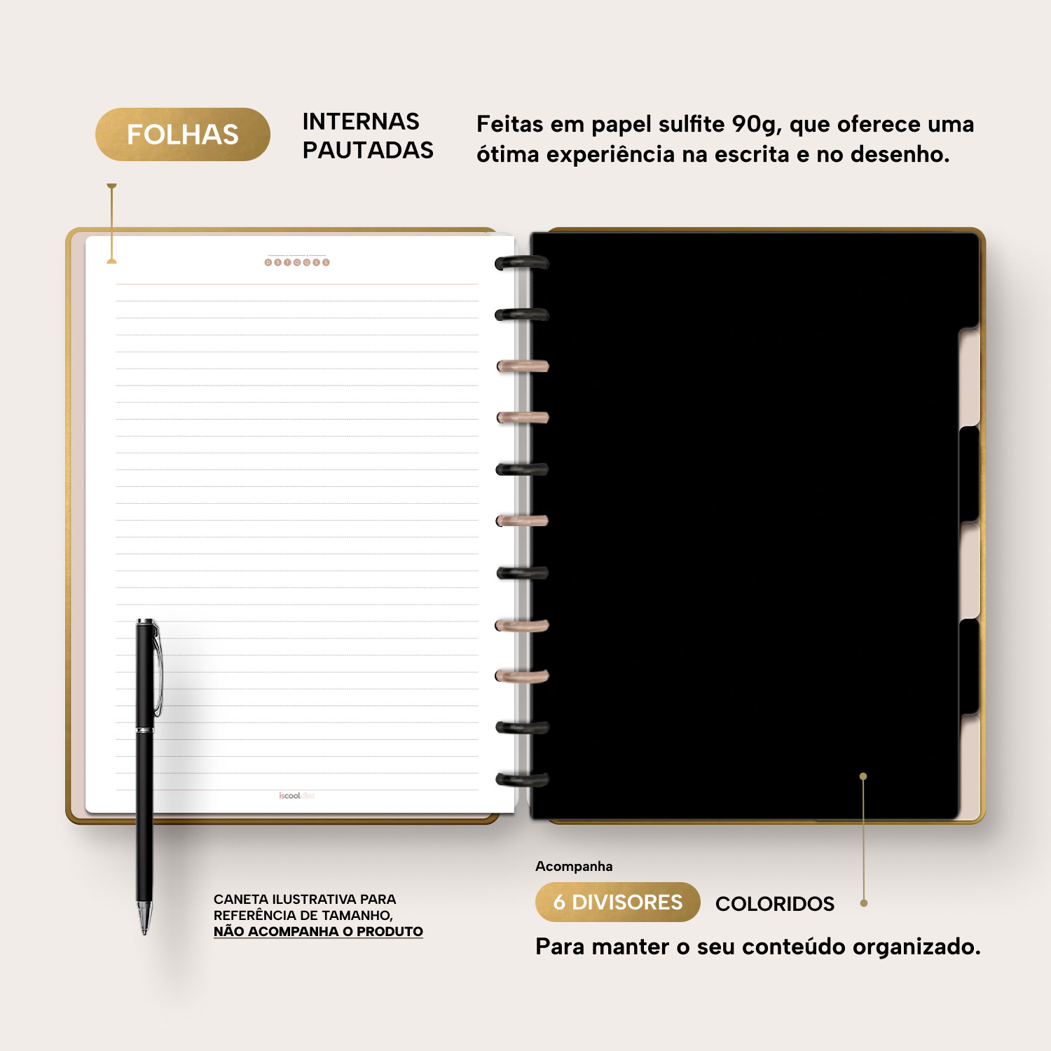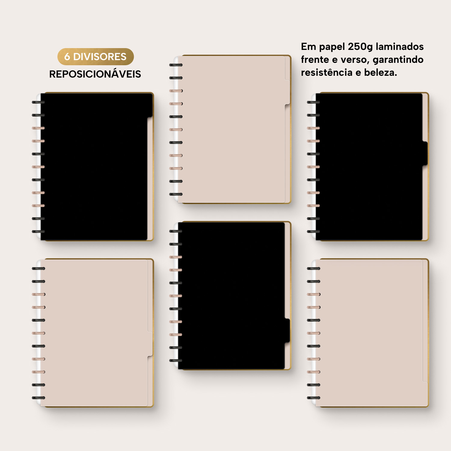 A capa é dura, com impressão digital de alta definição, e acompanha 6 lindas divisórias que você pode colocar em qualquer local do caderno, funcionando como o guia perfeito para sua organização.