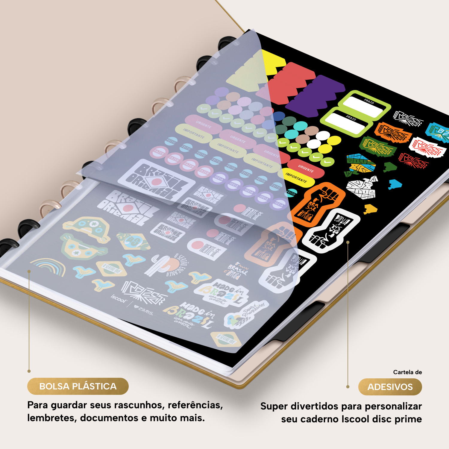 Além de tudo isso, o iscooldisc Prime conta com detalhes que fazem toda a diferença: elástico para fechamento da capa, muito mais estilo e privacidade para suas anotações; bolsa plástica para guardar seus rascunhos, referências, lembretes, documentos e uma cartela de adesivos incríveis, para que você possa personalizar seu caderno do seu jeitinho!